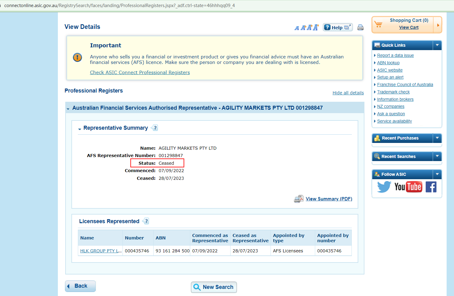The Agility Markets platform is promoted as the trading name of Agility Markets Pty Ltd. It is located in Australia and is regulated by Australian Securities & Investments Commission (ASIC) (AR 001298847). It provides investment and trading services in financial derivatives such as foreign exchange, indices, commodities, precious metals, and crude oil. After inquiry, the company name corresponding to Australian ASIC AR 001298847 is AGILITY MARKETS PTY LTD, which is an authorized representative of AR and has no registered website address. The company's license was canceled on May 28, 2023, and is obviously no longer subject to supervision.The truth is that Agility Markets is not regulated by any regulators. Letting it hold or control investors' money is unsafe, and the money can not be protected by any laws.Therefore, Agility Markets is a scam.