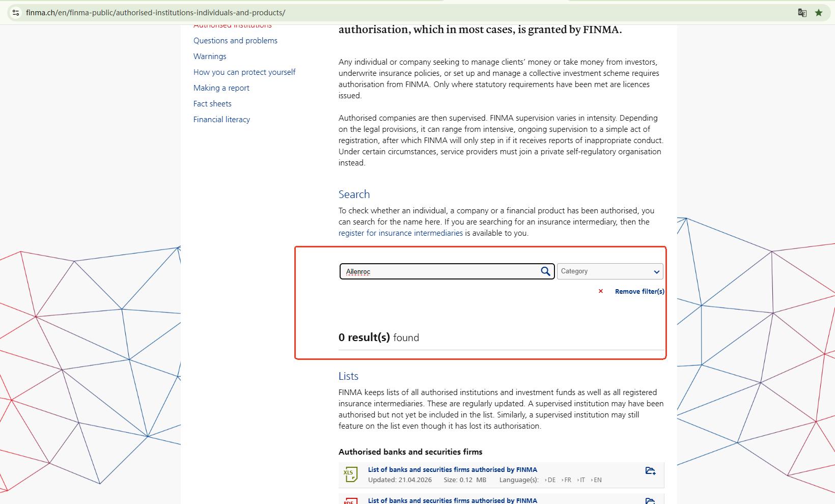 Besides, Ailenroc claims that it was registered in Switzerland. We searched the official register of the Swiss Financial Market Supervisory Authority (FINMA) using all available details, but found no record of Ailenroc or any associated company.