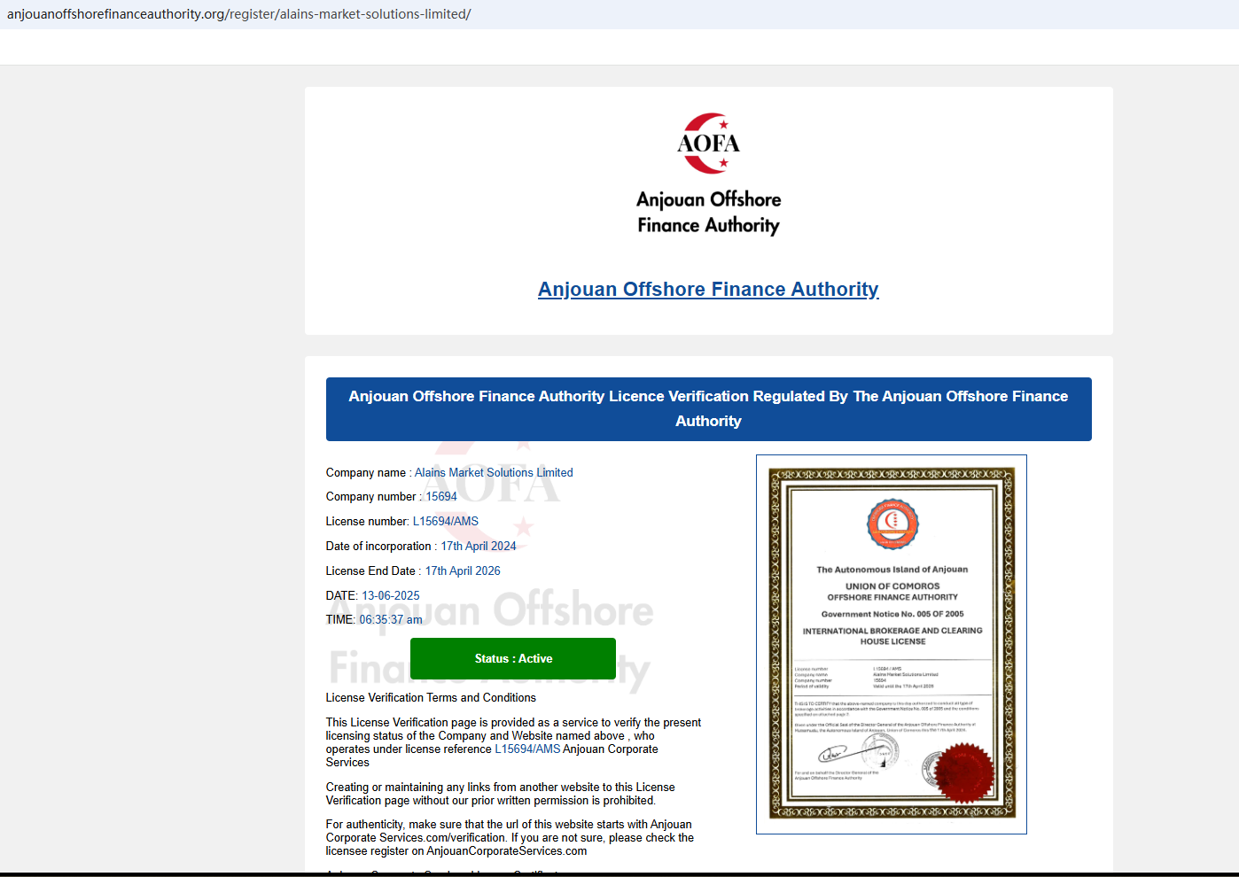 It claims to be a reliable company and is regulated by Anjouan Offshore Finance Authority (AOFA), but upon investigation, we found that it has no registered website on AOFA, so investors cannot conduct further verification. More importantly, the regulatory agency is an offshore regulator, the regulatory supervision is unclear, and there are doubts about infringement.