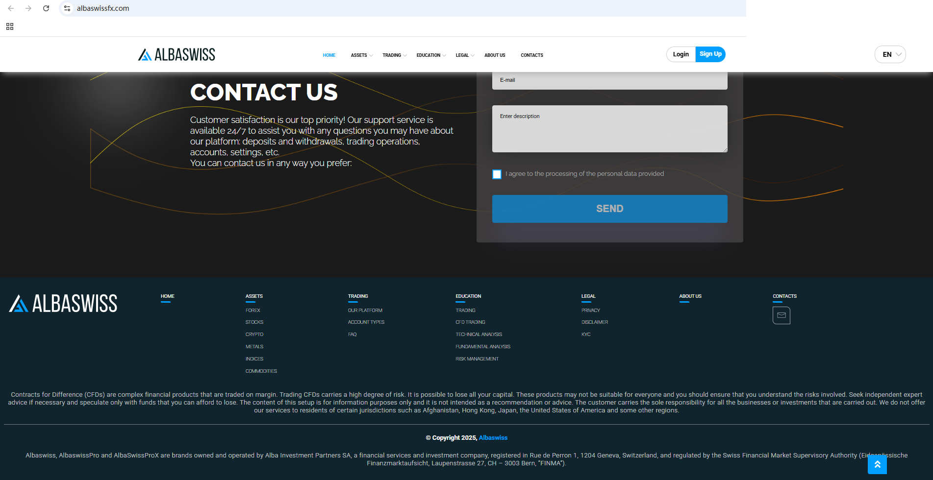 According to its website, it claims to be a reliable company and regulated in Switzerland. Ironically, we found that the Swiss Financial Market Supervisory Authority (FINMA) issued a warning against Albaswiss, stating that this broker is not entered in its commercial register.