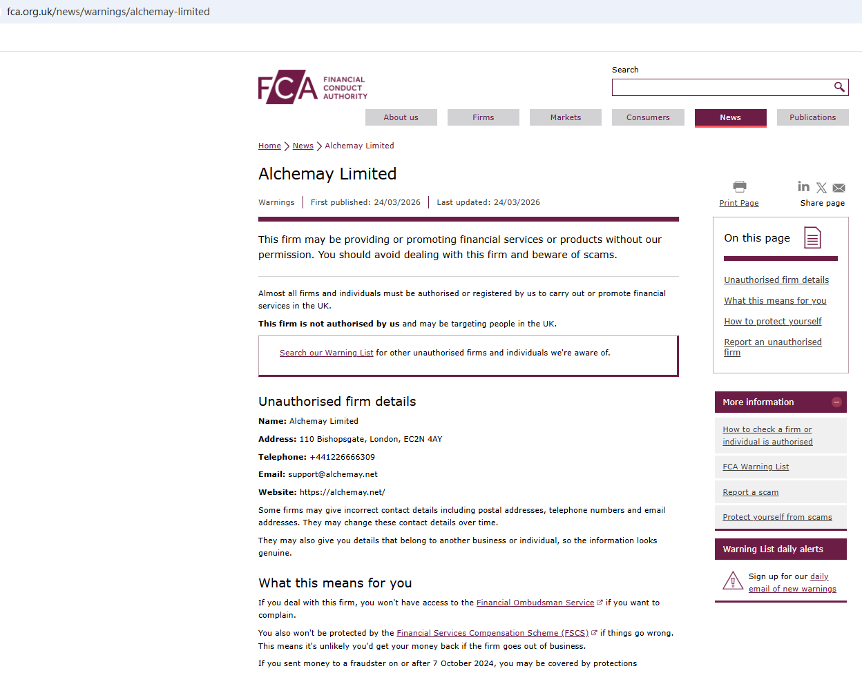 On Mar 24, 2026, the Financial Conduct Authority (FCA) issued a warning regarding Alchemay , suspecting that this company may be offering financial services or products without the necessary authorization. https://www.fca.org.uk/news/warnings/alchemay-limited