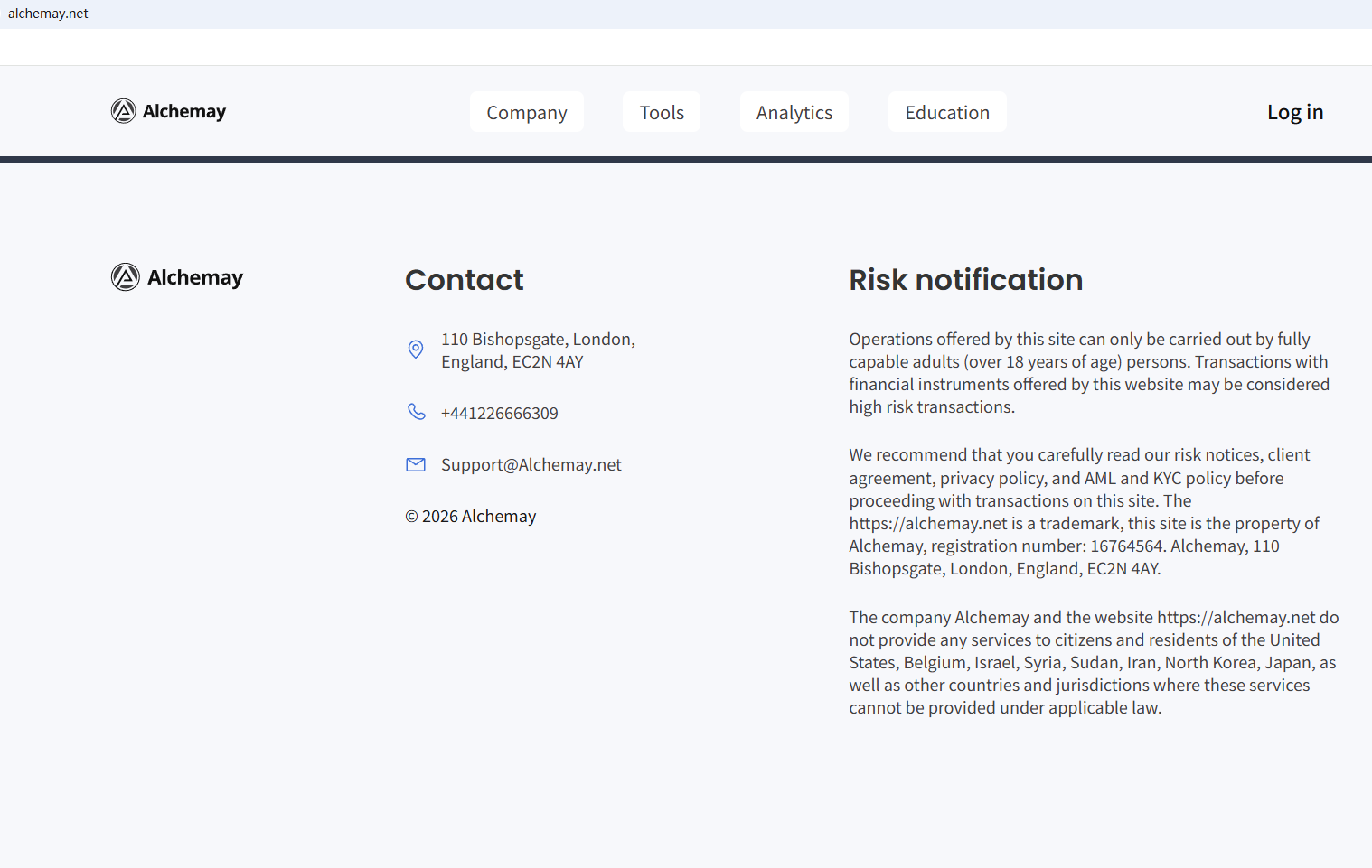 According to its website, it is located in the UK. Upon investigation, we found that the Financial Conduct Authority (FCA) issued a warning regarding Alchemay , suspecting that this company may be offering financial services or products without the necessary authorization.
