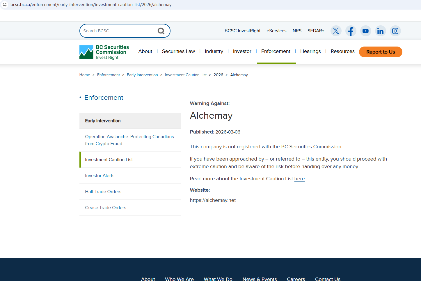 On March 6, 2026, the British Columbia Securities Commission (BCSC) issued a warning against Alchemay, stating that this broker is not registered to trade in, or advise on, securities or derivatives in BC. https://www.bcsc.bc.ca/enforcement/early-intervention/investment-caution-list/2026/alchemay