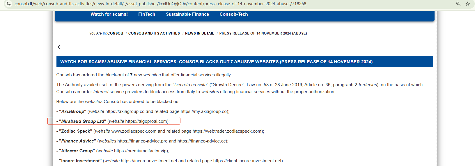 The website of Algoproai (Mirabaud Group Ltd) seems to be relatively new, with its domain registered in June 2024. The brand claims to be owned by a company called Mirabaud Group Ltd, allegedly regulated by the Financial Conduct Authority (FCA). However, this company has been flagged by the FCA as a clone firm operating a phishing website. Anyway, this fact indicates that Algoproai (Mirabaud Group Ltd) is not reliable. In addition, the Italian Companies and Exchange Commission (CONSOB) ordered Algoproai (Mirabaud Group Ltd)'s website to be blacked out since it offers financial services illegally in Italy.