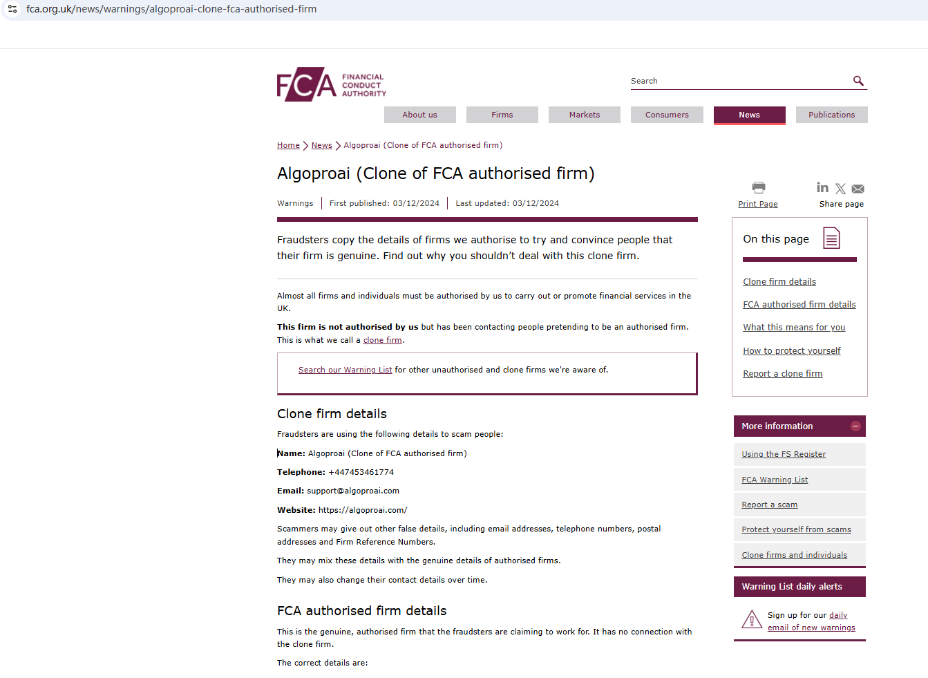 The website of Algoproai (Mirabaud Group Ltd) seems to be relatively new, with its domain registered in June 2024. The brand claims to be owned by a company called Mirabaud Group Ltd, allegedly regulated by the Financial Conduct Authority (FCA). However, this company has been flagged by the FCA as a clone firm operating a phishing website. Anyway, this fact indicates that Algoproai (Mirabaud Group Ltd) is not reliable. In addition, the Italian Companies and Exchange Commission (CONSOB) ordered Algoproai (Mirabaud Group Ltd)'s website to be blacked out since it offers financial services illegally in Italy.In essence, Algoproai (Mirabaud Group Ltd) is not regulated by any governing body. Entrusting it with investors' funds is highly risky, as there are no legal protections in place to safeguard the funds.Algoproai (Mirabaud Group Ltd) appears to be a scam.