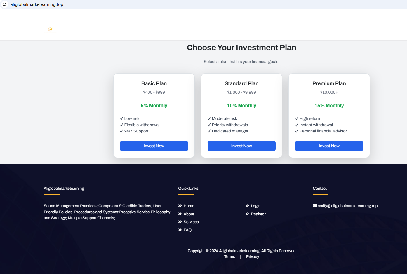 According to its website, it claims to be a reliable UK-incorporated company. However, it does not display any strong regulatory credentials on its website. In addition, the Financial Conduct Authority (FCA) issued a warning regarding Aliglobalmarketearning, suspecting that this company may be offering financial services or products without the necessary authorization.