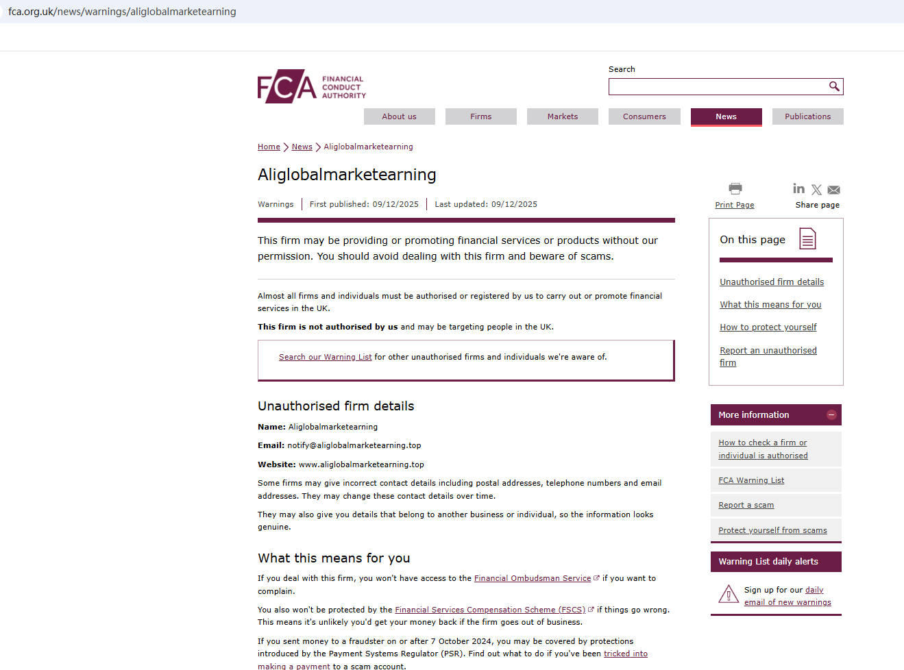 On Dec 9, 2025, the Financial Conduct Authority (FCA) issued a warning regarding Aliglobalmarketearning, suspecting that this company may be offering financial services or products without the necessary authorization. https://www.fca.org.uk/news/warnings/aliglobalmarketearning
