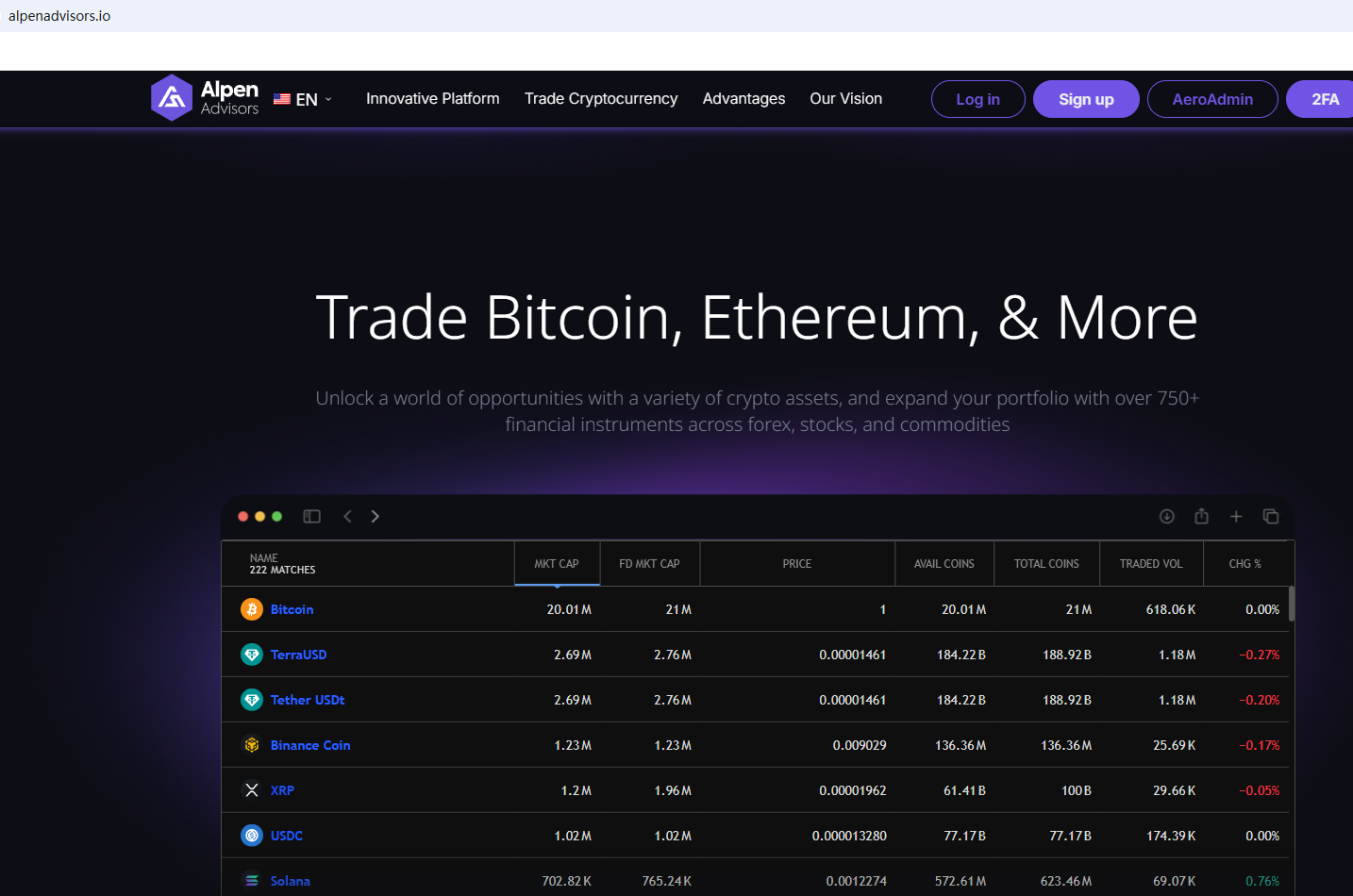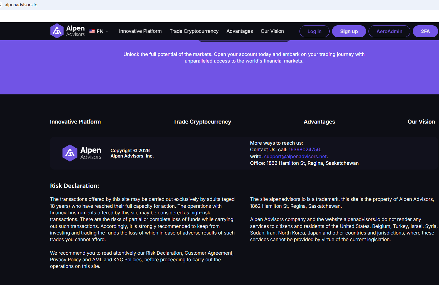 According to its website, it is located in Canada. Upon investigation, no matching information was found in the Investment Industry Regulatory Organization of Canada (IIROC). In addition, the British Columbia Securities Commission (BCSC) issued a warning against Alpen Advisors, stating that this broker is not registered to trade in, or advise on, securities or derivatives in BC.