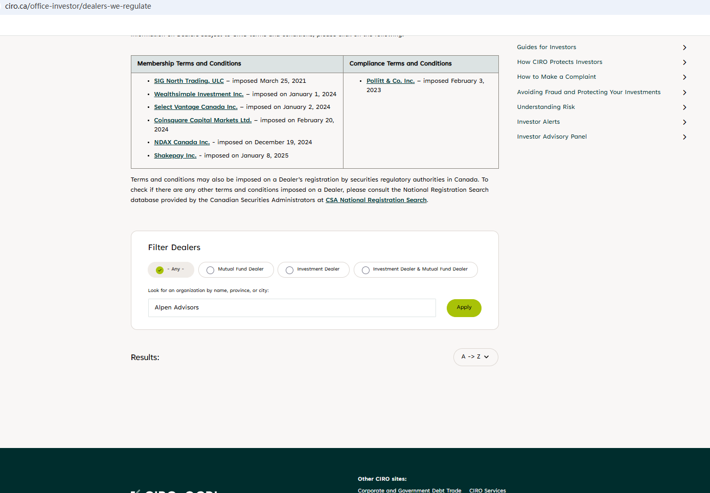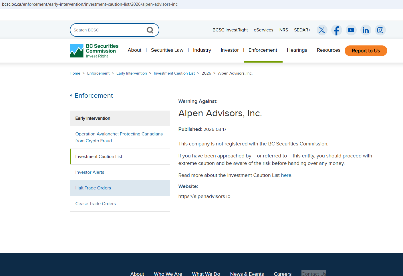 On March 17, 2026, the British Columbia Securities Commission (BCSC) issued a warning against Alpen Advisors, stating that this broker is not registered to trade in, or advise on, securities or derivatives in BC. https://www.bcsc.bc.ca/enforcement/early-intervention/investment-caution-list/2026/alpen-advisors-inc