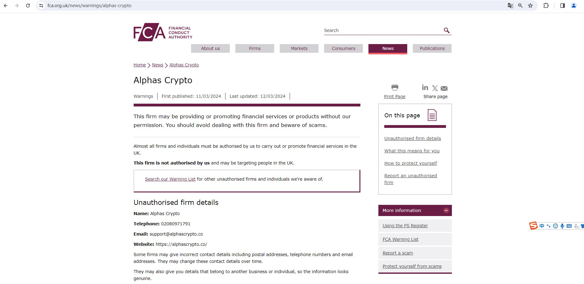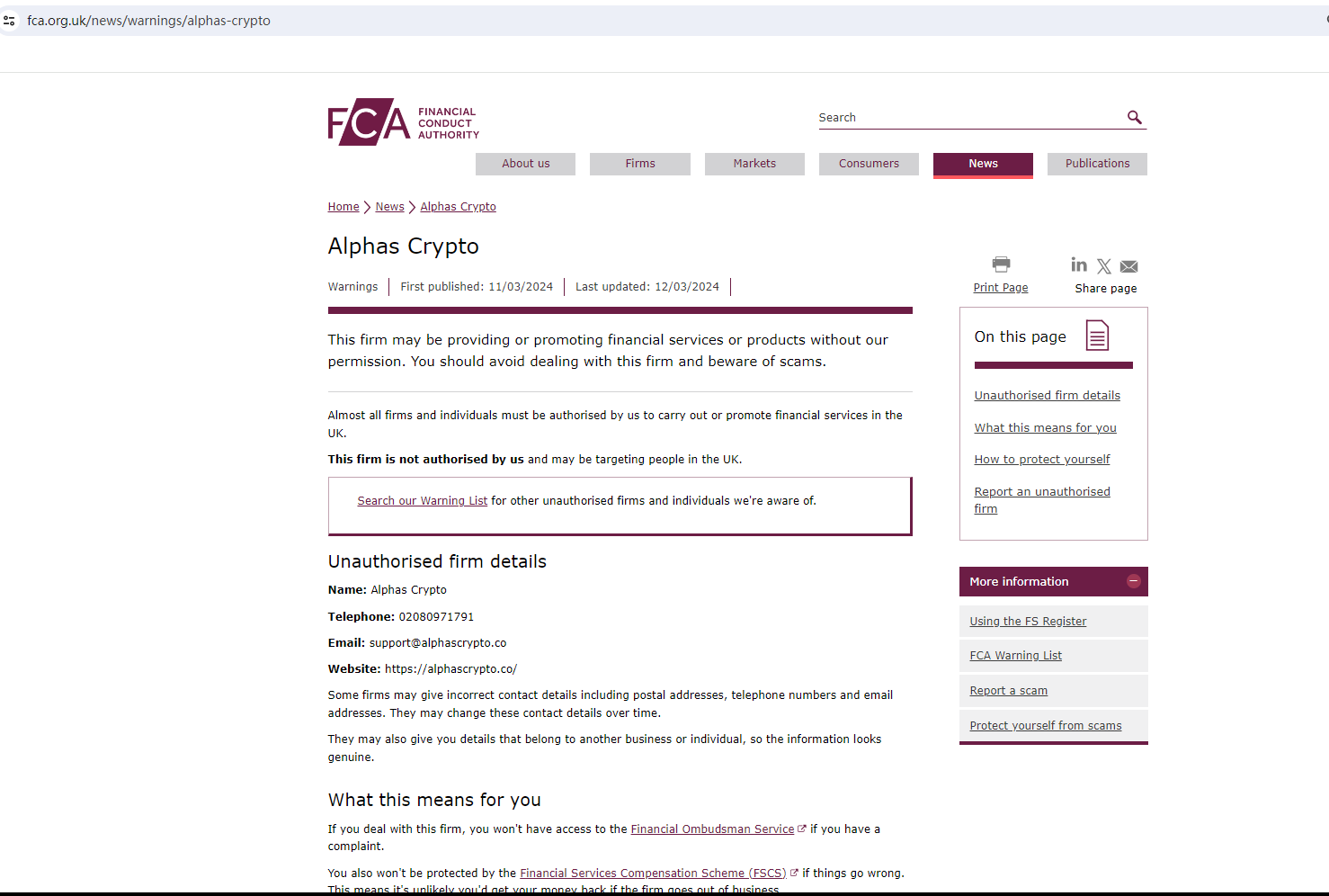 BrokersView has cause to suspect that AlphasCrypto is an unregulated broker. It is an illegal trading platform, as evidenced by the warning issued by the Malta Financial Services Authority (MFSA).In this warning, the MFSA confirmed that AlphasCrypto is a clone of an MFSA-licensed firm and is neither a Maltese registered company nor licensed or authorised by the MFSA to provide any financial services in/from Malta.In essence, AlphasCrypto is not regulated by any governing body. Entrusting this broker with investors' funds is highly risky, as there are no legal protections in place to safeguard the funds. AlphasCrypto is unequivocally a scam.