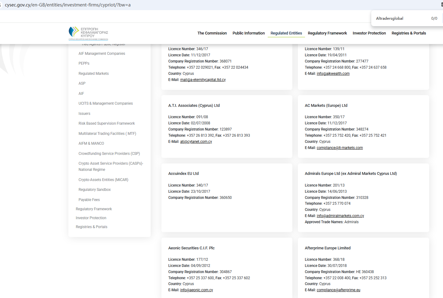 According to its website, it is regulated by both the Financial Conduct Authority (FCA) and the Cyprus Securities and Exchange Commission (CySEC). However, a search revealed no matching information with CySEC. Furthermore, the FCA issued a warning regarding Altradersglobal inv.com, suspecting that this company may be offering financial services or products without the necessary authorization.