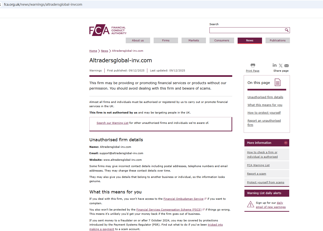 On Dec 9, 2025, the Financial Conduct Authority (FCA) issued a warning regarding Altradersglobal inv.com, suspecting that this company may be offering financial services or products without the necessary authorization. https://www.fca.org.uk/news/warnings/altradersglobal-invcom