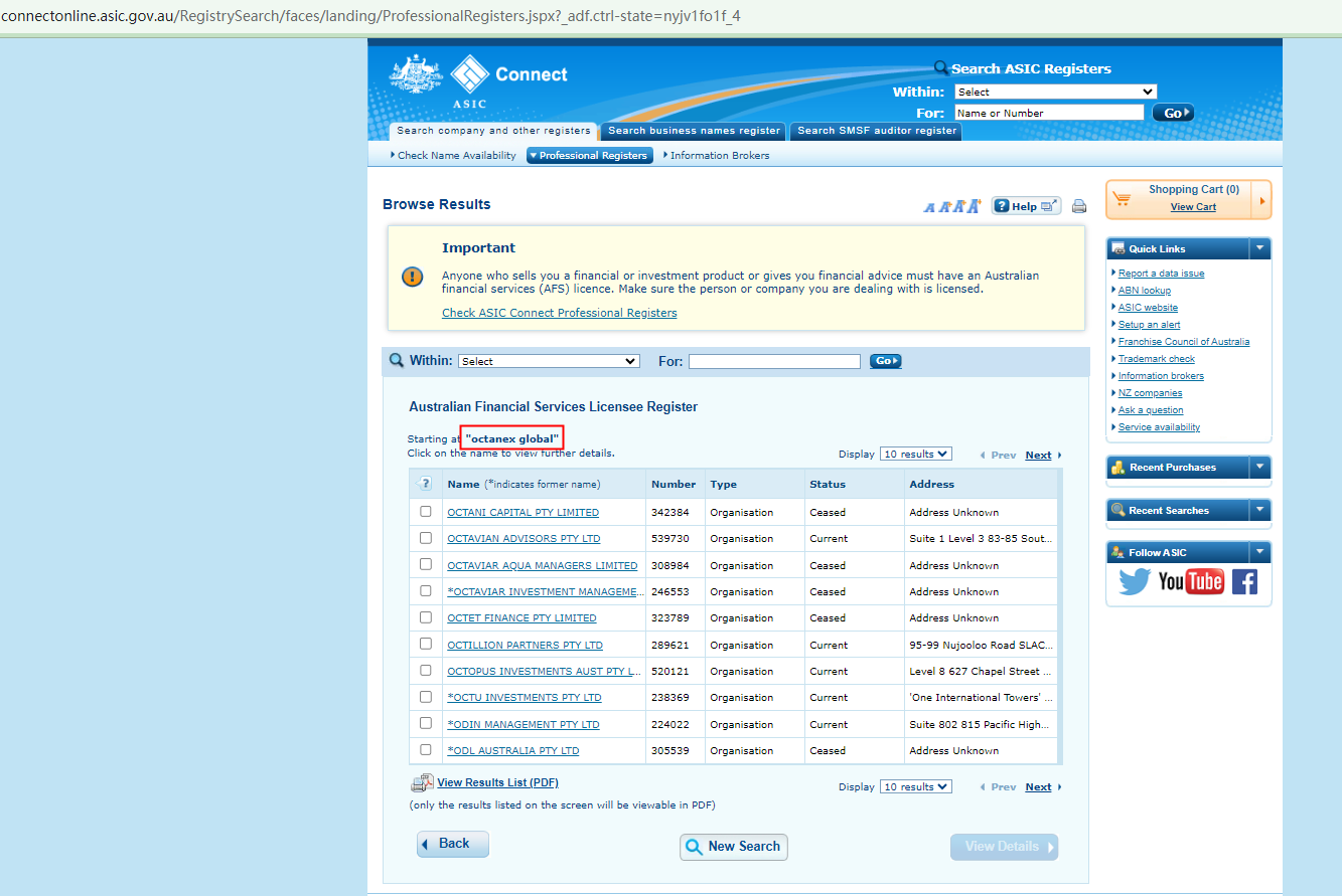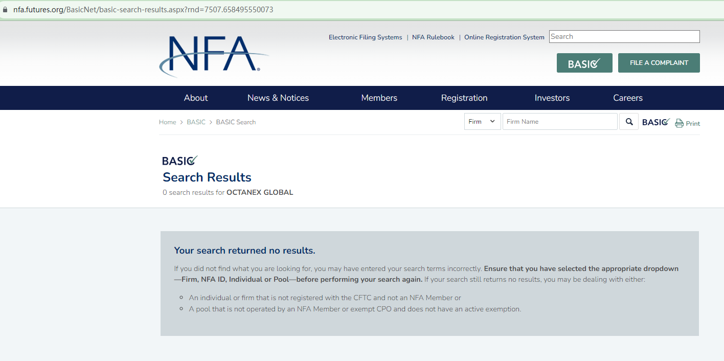According to its website, APEX FX FINANCE claims to be registered in Australia, upon investigation, there is no matching information found in the Australian Securities & Investment Commission (ASIC) and in the National Futures Association . Otherwise, we didn't find any matching information using the name Octanex Global.