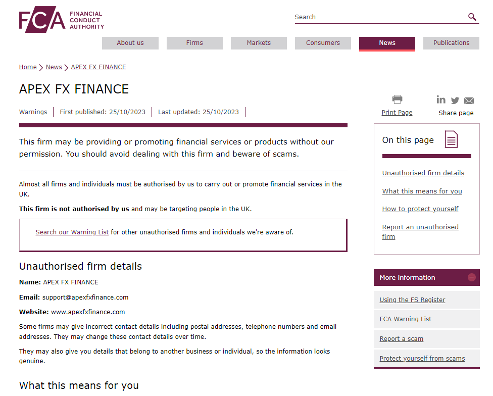 The United Kingdom Financial Conduct Authority (UK FCA) issued a warning that APEX FX FINANCE was providing finacial services or products without authorisation.
