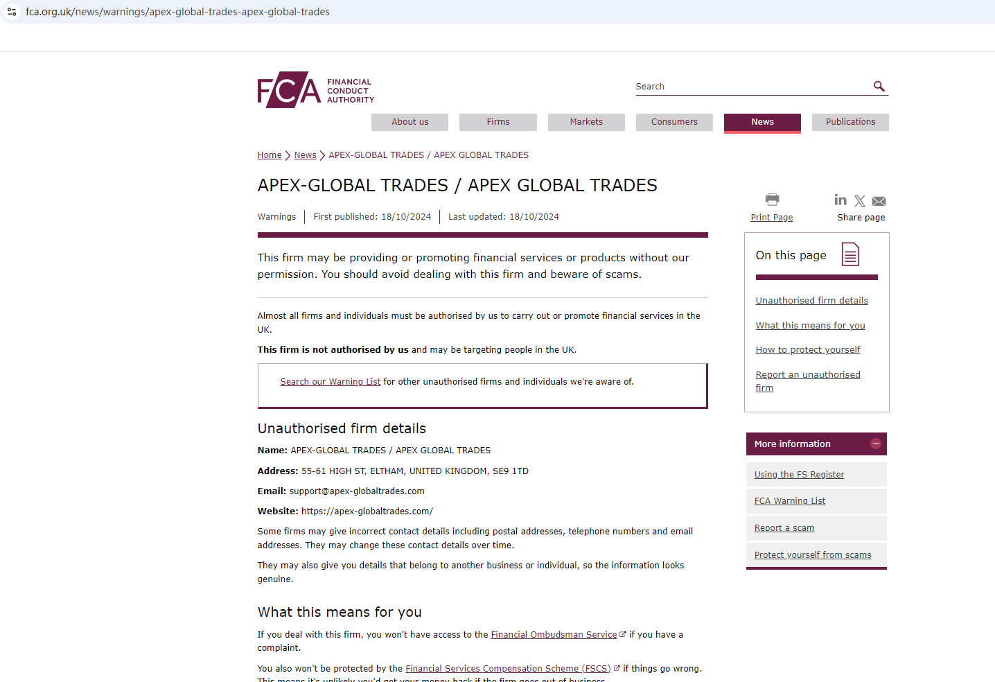 In addition, the United Kingdom Financial Conduct Authority (FCA) issued a warning against APEX GLOBAL TRADES, believing this company might be providing financial services or products without authorisation in the UK.
