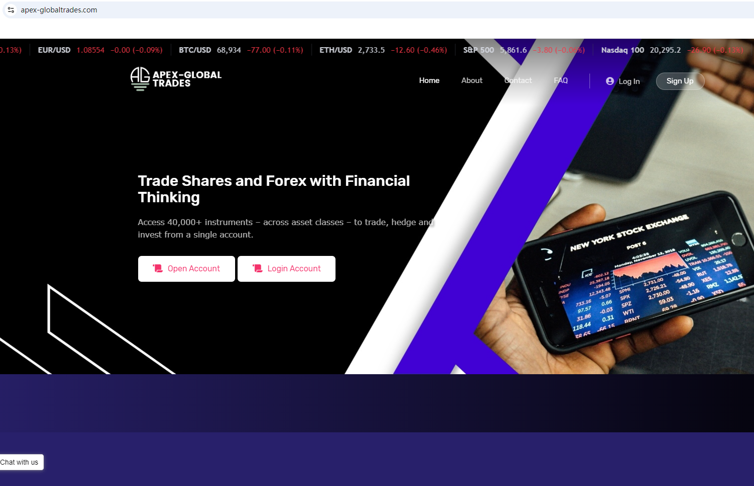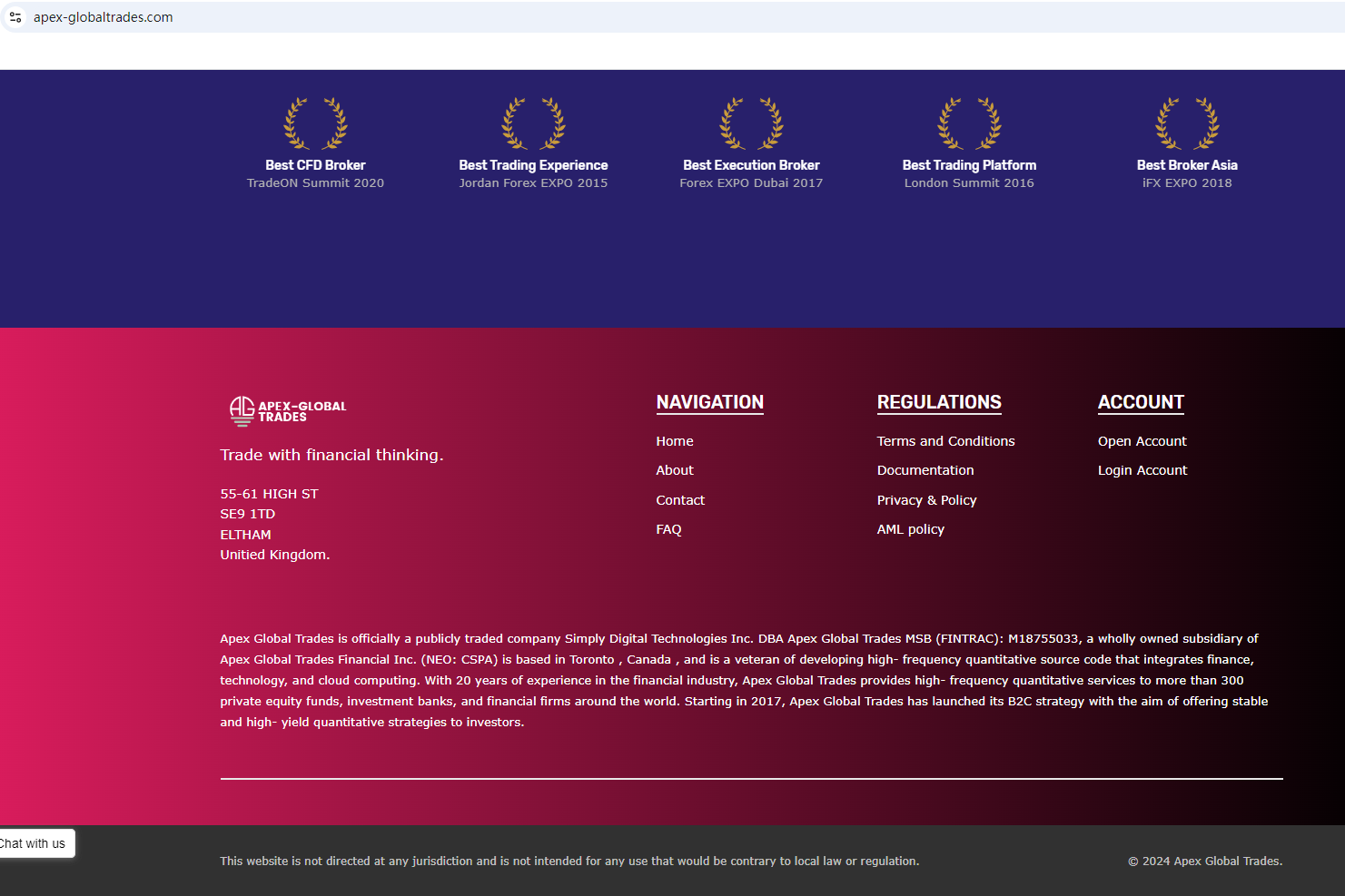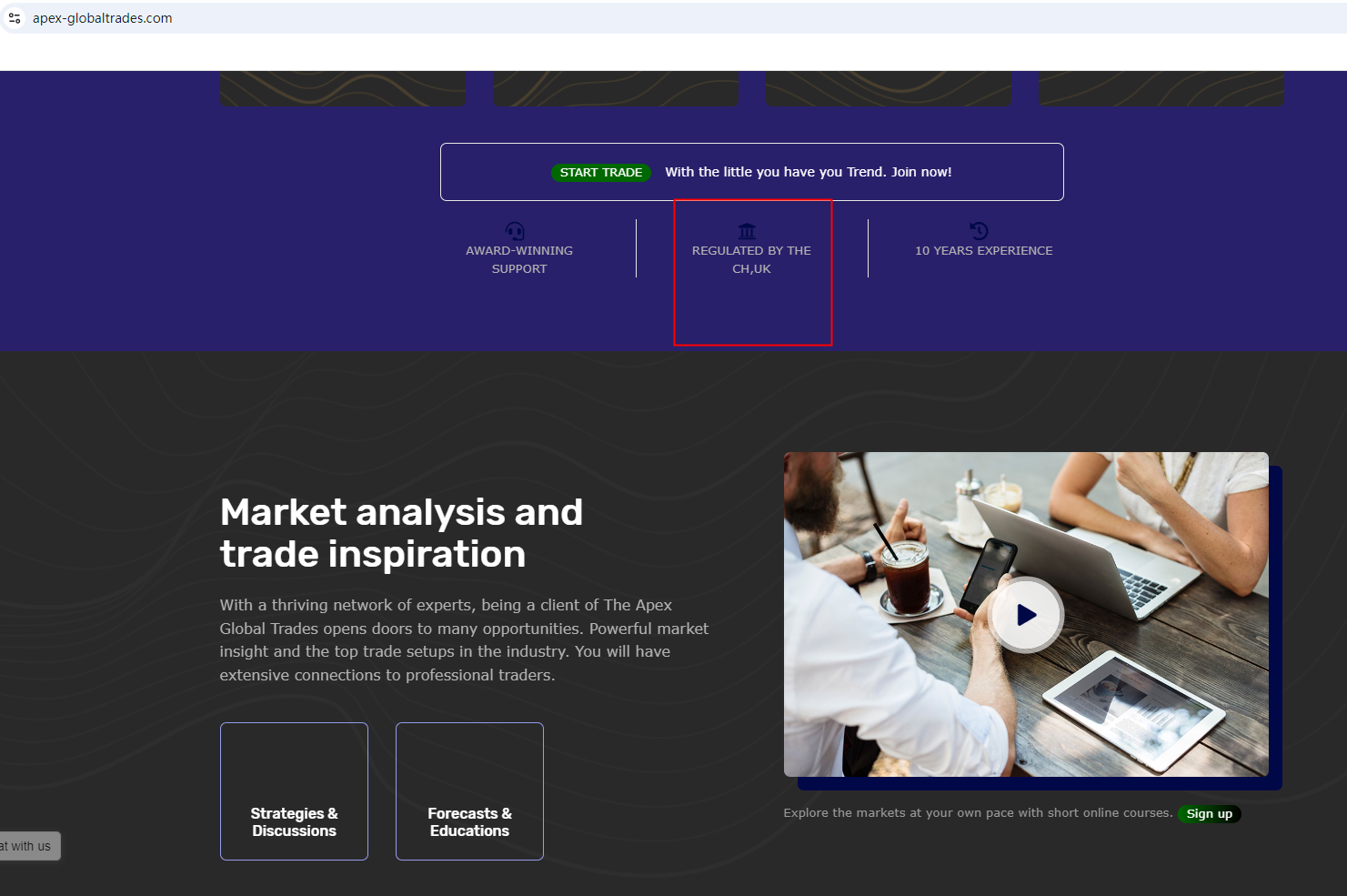 The website template used by the company is a generic "scam website" template. Such templates usually have the same layout design, logo design, text description, etc., and have been flagged many times by Brokersview before, such as STARFOREX LIVE INVESTMENT. Although it states on the website that it is regulated by Companies House (CH), CH does not have the right to regulate foreign exchange, so it is unreliable.In addition, the United Kingdom Financial Conduct Authority (FCA) issued a warning against APEX GLOBAL TRADES, believing this company might be providing financial services or products without authorisation in the UK.The truth is that APEX GLOBAL TRADES is not regulated by any regulators. Letting it hold or control investors'money is unsafe, and the money can not be protected by any laws.APEX GLOBAL TRADES is a scam.