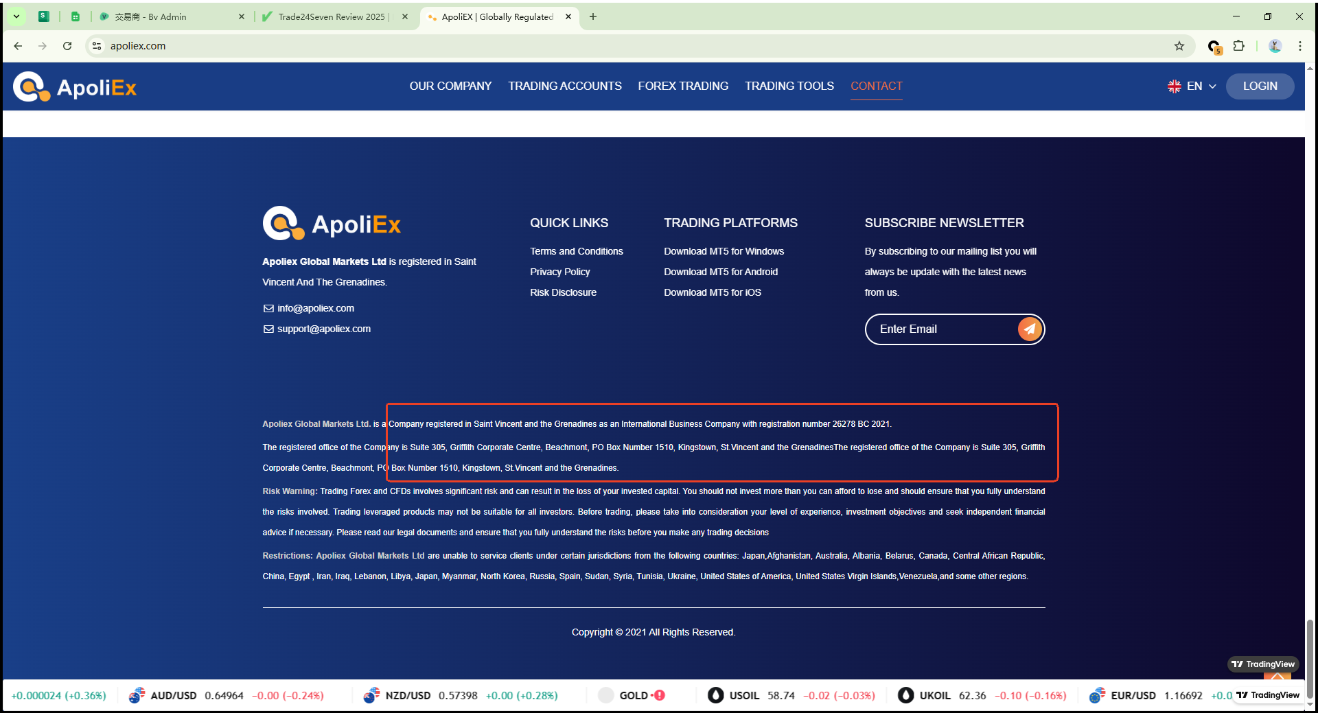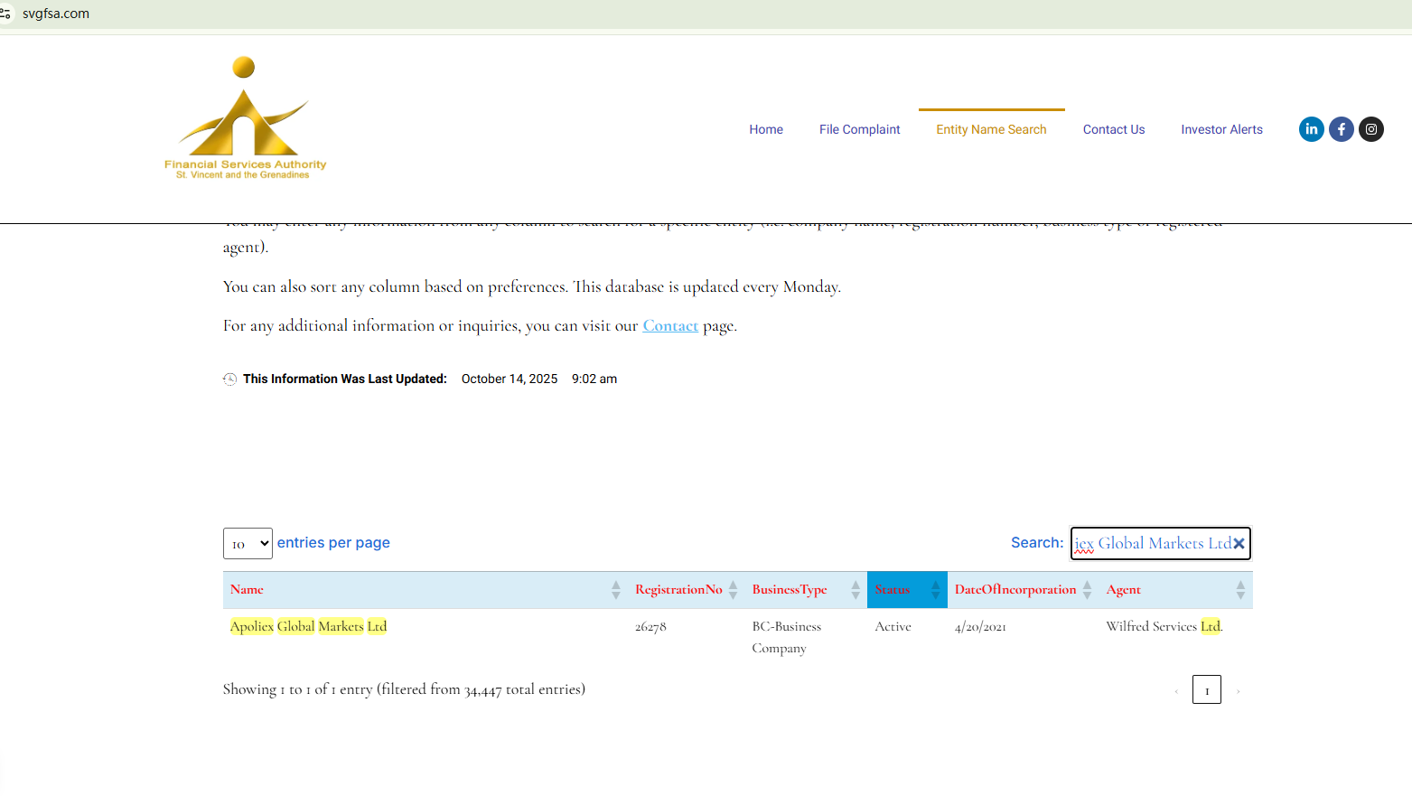 Apoliex claims to operate under Apoliex Global Markets Ltd, which is reportedly merely registered with the Financial Services Authority (FSA) of Saint Vincent and the Grenadines. While we confirm that a matching company exists in the registry of SVG FSA, this only grants International Business Company (IBC) status. It does not constitute a valid financial license. The SVG FSA has clearly stated that it does not regulate or license forex brokers.