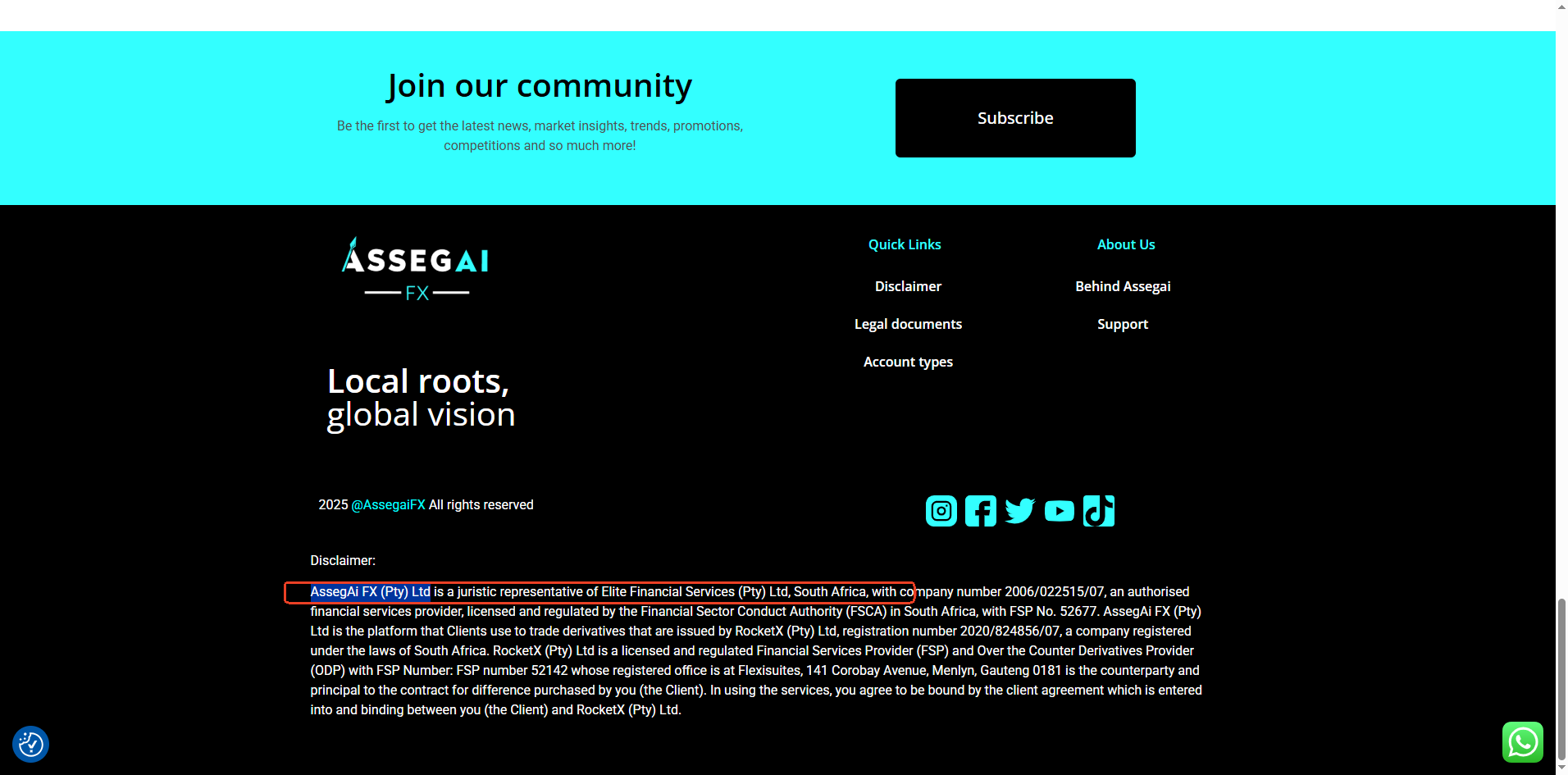 AssegAi FX claims to operate as a trading name of AssegAi FX (Pty) Ltd, a company registered in South Africa, and further states that it acts as a juristic representative of Elite Financial Services (Pty) Ltd, an entity licensed and regulated by the Financial Sector Conduct Authority (FSCA).