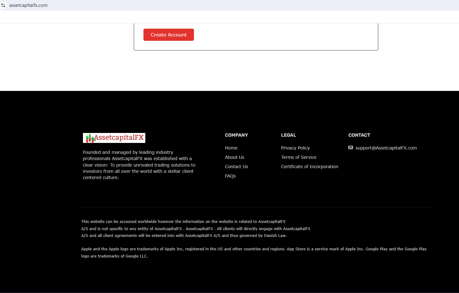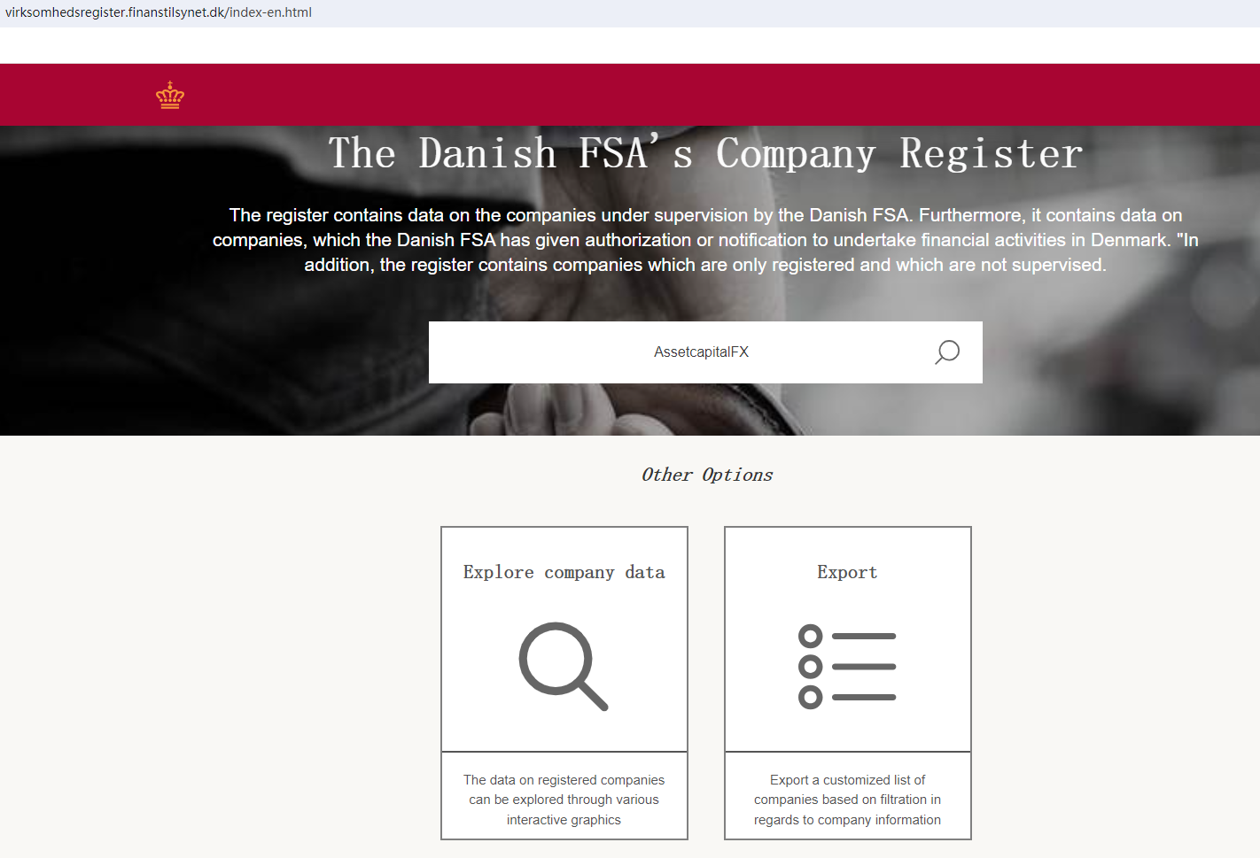 According to its website, it is governed by Danish Law. Upon investigation, no matching information was found in the Finanstilsynet, Denmark (Danish FSA).In addition, the Financial Conduct Authority (FCA) issued a warning against AssetcapitalFX, believing this company might be providing financial services or products without proper authorization in the UK.In essence, AssetcapitalFX is not regulated by any governing body. Entrusting it with investors' funds is highly risky, as there are no legal protections in place to safeguard the funds.AssetcapitalFX appears to be a scam.