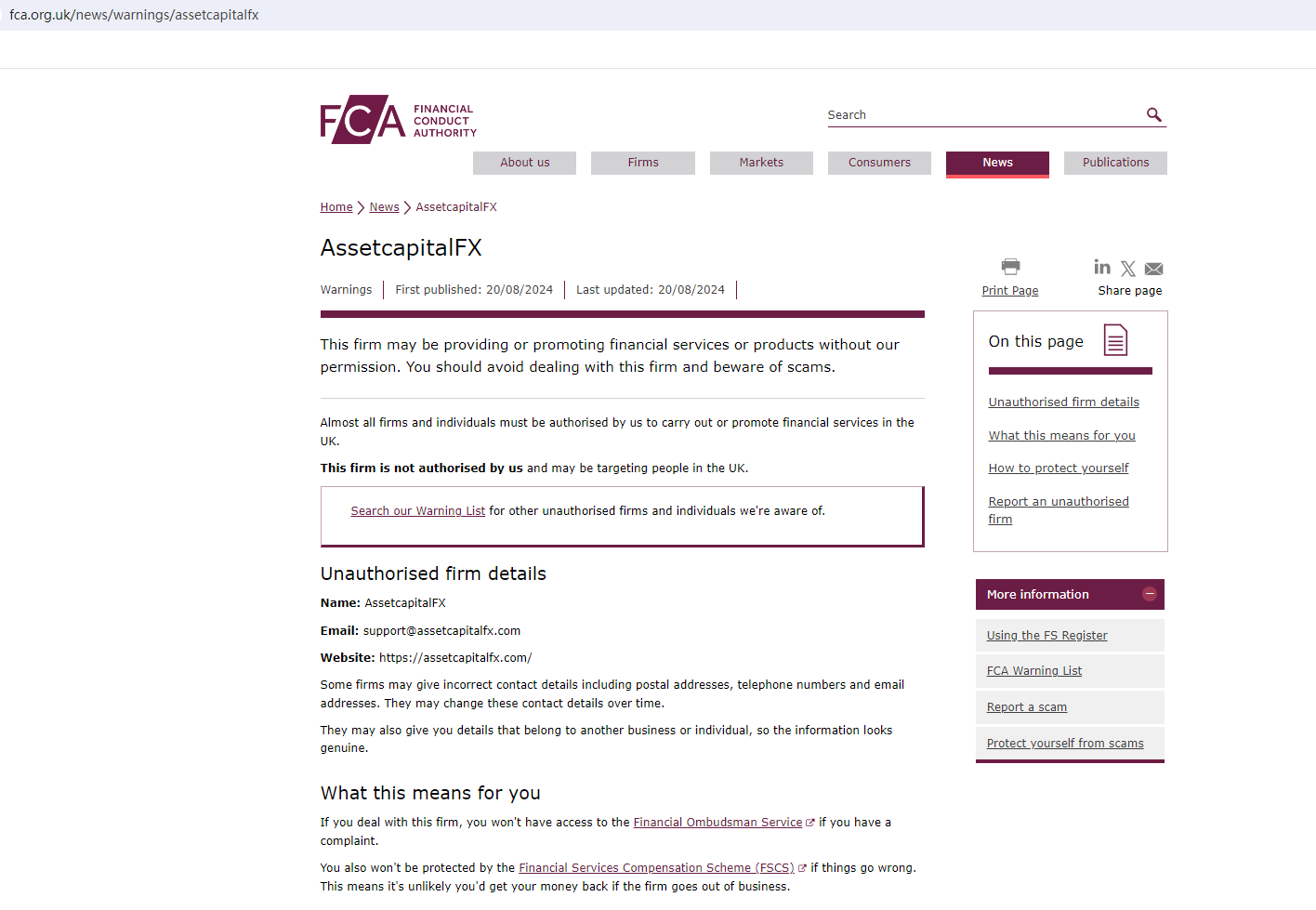 In addition, the Financial Conduct Authority (FCA) issued a warning against AssetcapitalFX, believing this company might be providing financial services or products without proper authorization in the UK.