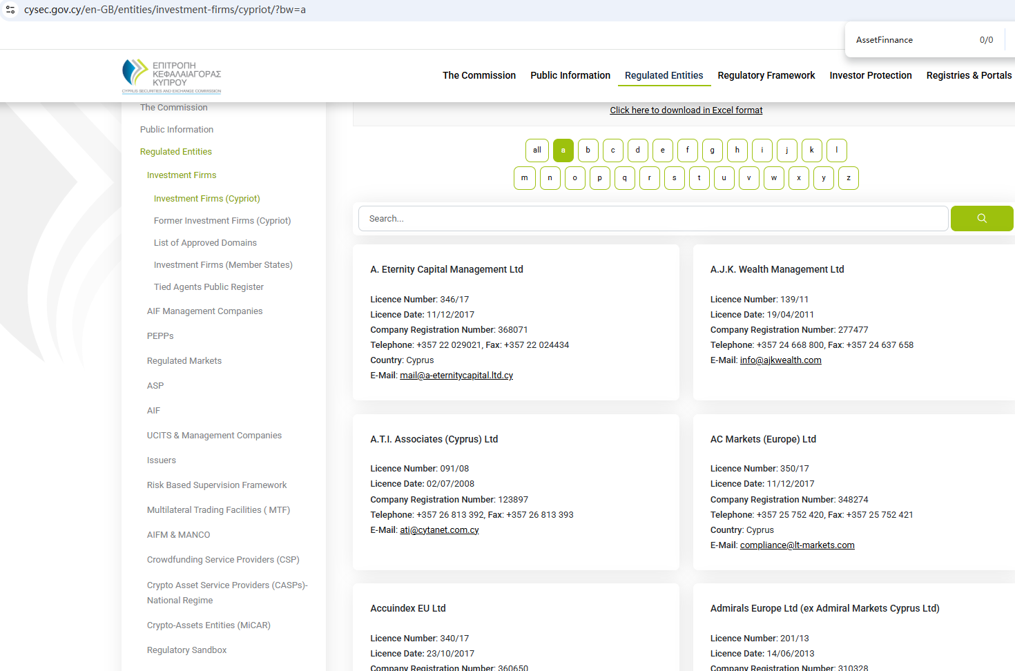 According to its website, it is regulated by both the Financial Conduct Authority (FCA) and the Cyprus Securities and Exchange Commission (CySEC). However, a search revealed no matching information with CySEC. Furthermore, the FCA issued a warning regarding AssetFinnance, suspecting that this company may be offering financial services or products without the necessary authorization.