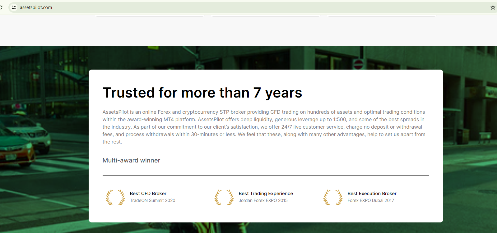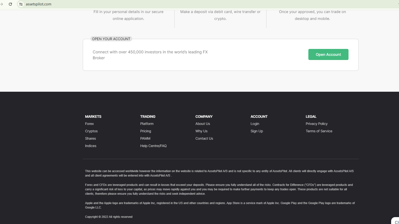Since it purports to have an office in the US, AssetsPilot has to be a member of the National Futures Association (NFA) to be a legitimate forex broker. But, our search for this company on the NFA register didn't yield any matching results.