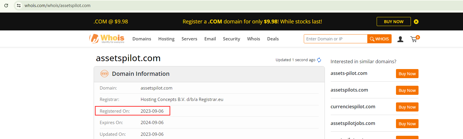 What's more, AssetsPilot asserts to have been trusted by customers for over seven years. However, the inception of its domain, assetspilot.com, can only be traced back to September 2023. This contradictory situation is a red flag for potential fraudulent activities.