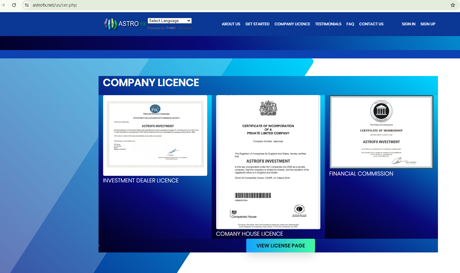 Astrofx portrays itself as a credible trading platform, citing three certificates from such authorities as the Mauritius Financial Services Commission (Mauritius FSC), the Companies House (CH), and the Financial Commission.