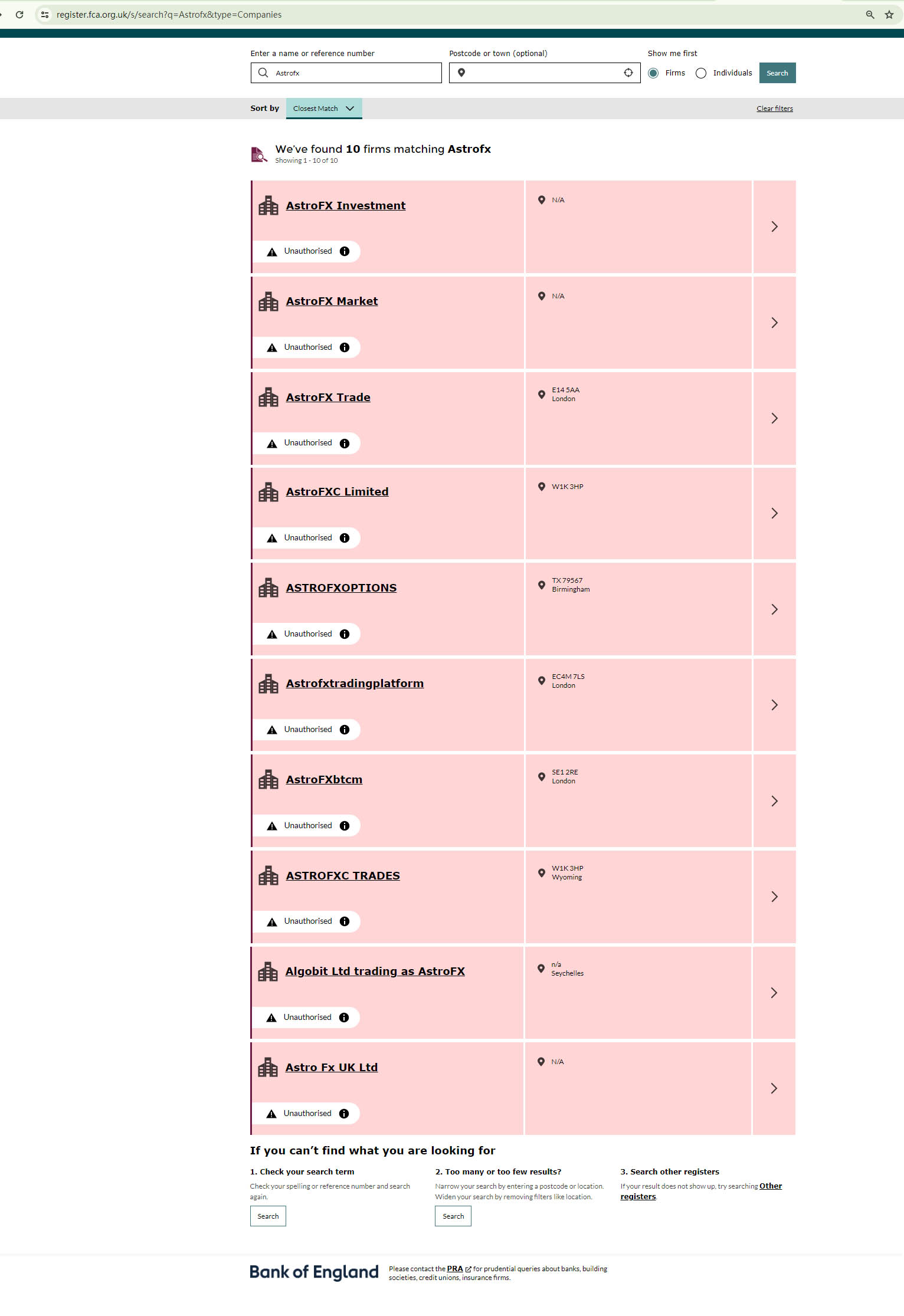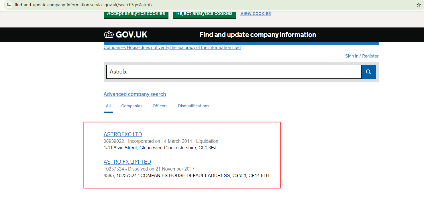 However, our investigations into this entity found no corroborating results to support its claims. These three certificate appear to be falsified. Given its claim of registration with the CH, we examined the Financial Conduct Authority (FCA) register. Interestingly, Interestingly, any company with "Astrofx" in its name is marked as unauthorized. This raises serious concerns about the platform's legitimacy.