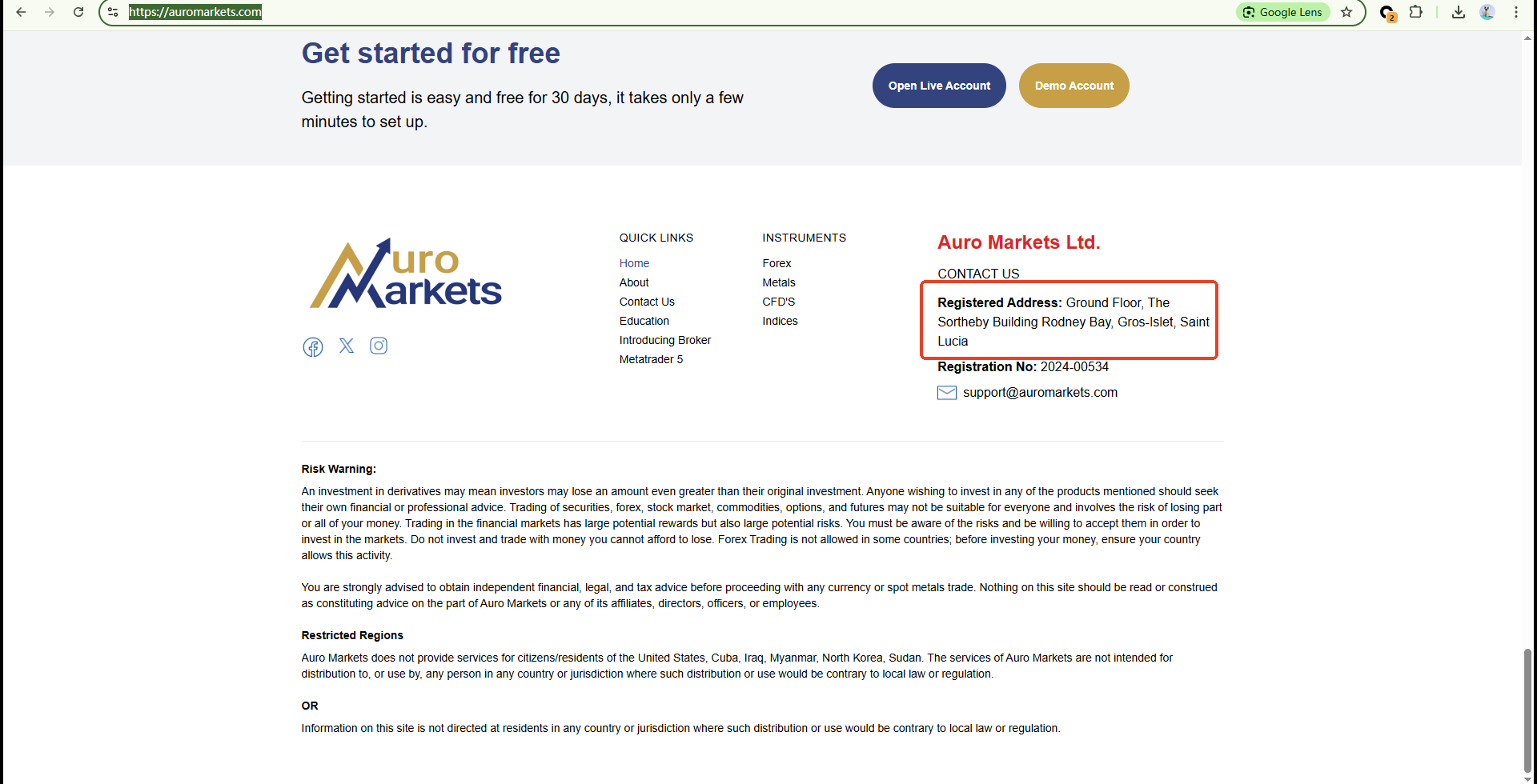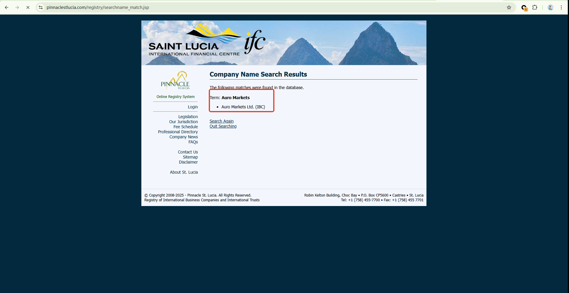Auro Markets’ official website reveals no evidence of financial regulation but only a claim of registration in Saint Lucia. While the company is listed in the registry of the Saint Lucia International Financial Centre (IFC), this only confirms its status as an International Business Company (IBC), not that it holds a valid financial license. Furthermore, The IFC does not regulate or license forex activities.