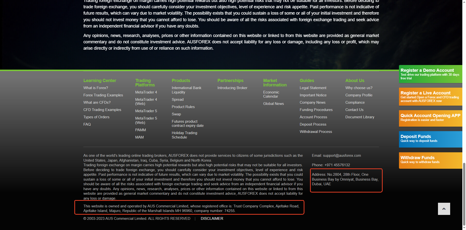 AUSFOREX claims to be owned and operated by AUS Commercial Limited and states that it is regulated under the jurisdiction of the Marshall Islands, where the company is registered. While we did locate AUS Commercial Limited in the Marshall Islands Registry (IRI), it is crucial to understand that the IRI is not a government regulatory authority, but a private registry service and does not oversee or license financial or forex trading activities. This registration only grants International Business Company (IBC) status, which carries no regulatory oversight.