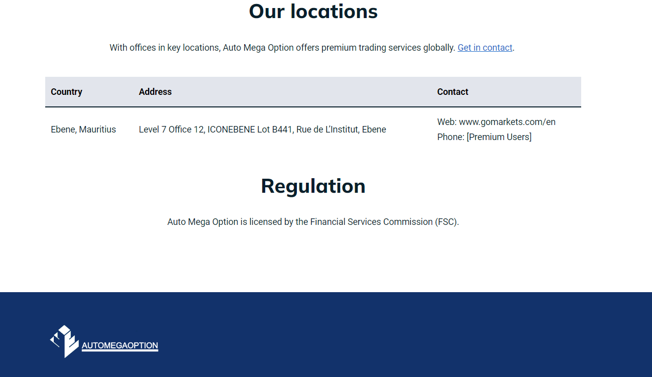 According to its website, Auto Mega Option claims to be regulated by the Mauritius Financial Services Commission (FSC). However, there is no matching information was found in the FSC.