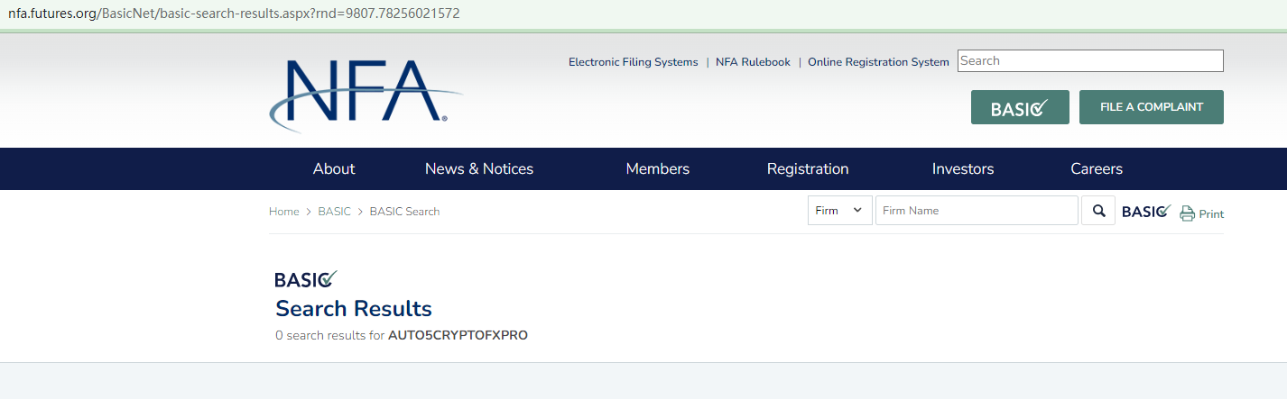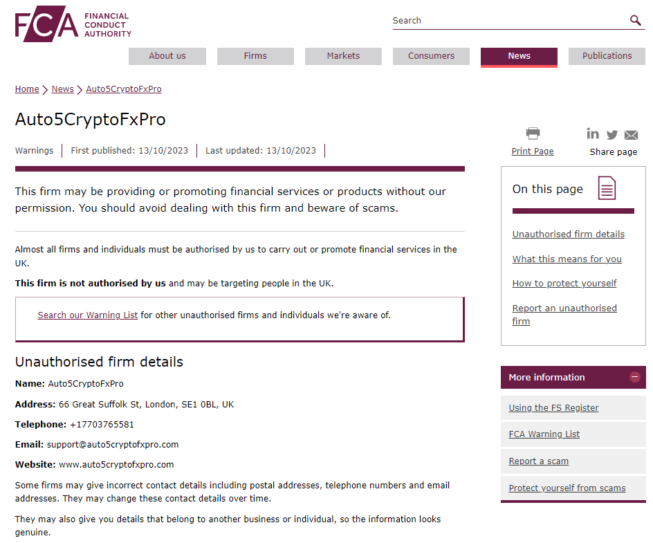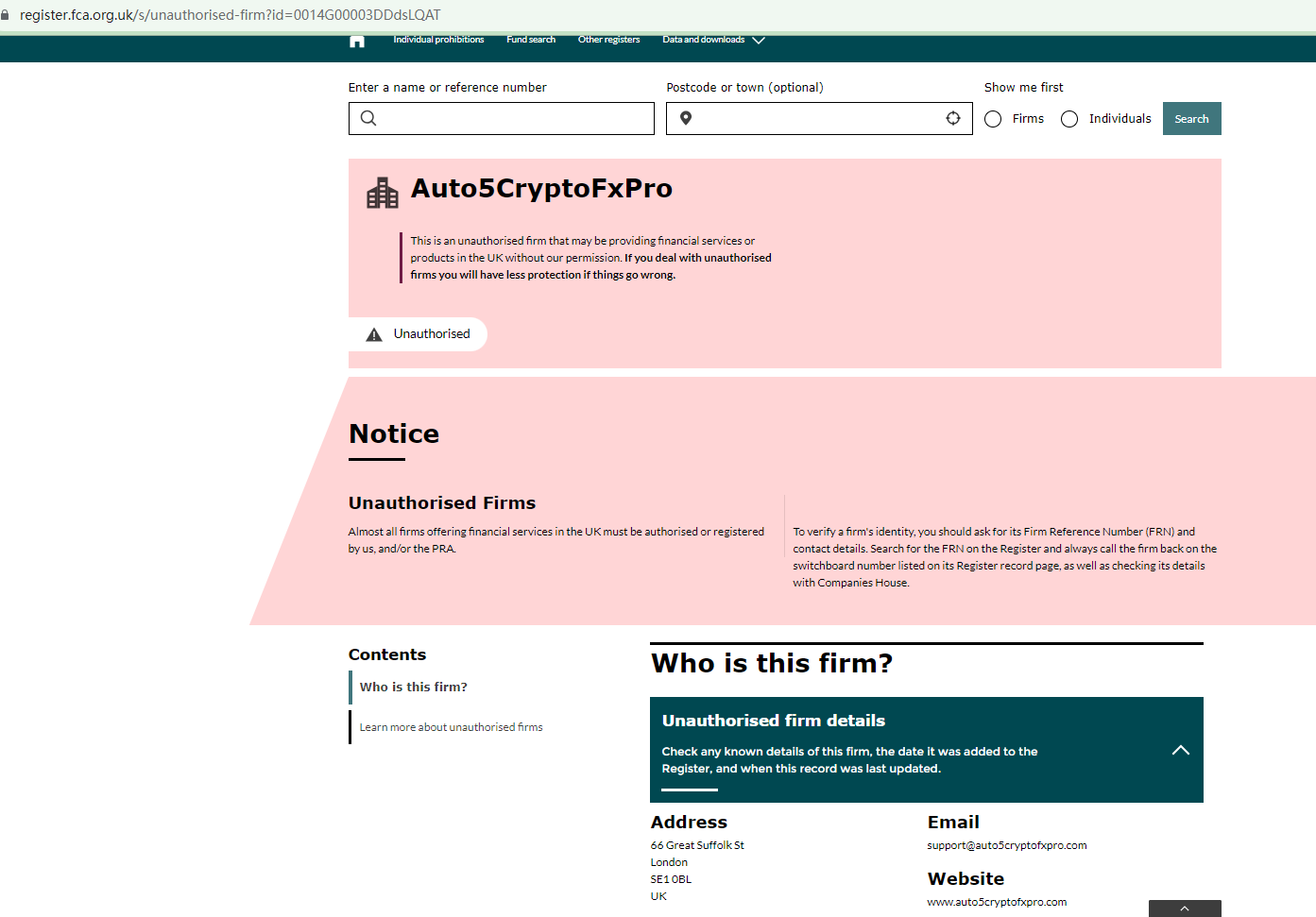 Auto5CryptoFxPro showcases an incorporation certificate from the Companies House (CH), claiming that its company name is Auto5CryptoFxPro LTD with company number 11445991. However, this company number belongs to another company that seems to have no association with it. What's more, even if Auto5CryptoFxPro were registered with the CH, the registration couldn't be considered as evidence to support its legitimacy in forex trading, as the CH has no authority to regulate the forex market and entities involved.While it claims to have addresses in the UK and the US, there are no indications that it is registered with the Financial Conduct Authority (FCA) and the National Futures Association (NFA). Thus, it is not subject to any governing body.In essence, Auto5CryptoFxPro is not regulated by any governing body. Entrusting this broker with investors' funds is highly risky, as there are no legal protections in place to safeguard the funds. Auto5CryptoFxPro is unequivocally a scam.