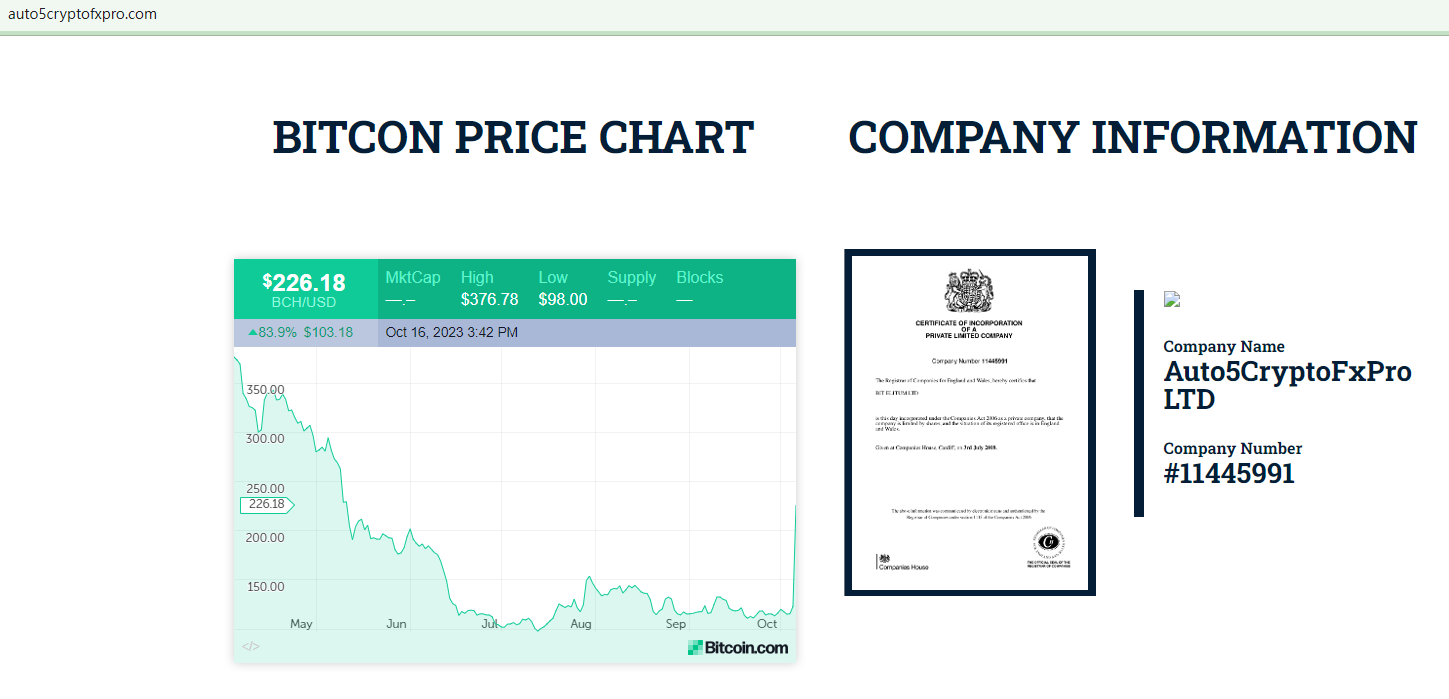 Auto5CryptoFxPro showcases an incorporation certificate from the Companies House (CH), claiming that its company name is Auto5CryptoFxPro LTD with company number 11445991. However, this company number belongs to another company that seems to have no association with it. What's more, even if Auto5CryptoFxPro were registered with the CH, the registration couldn't be considered as evidence to support its legitimacy in forex trading, as the CH has no authority to regulate the forex market and entities involved.