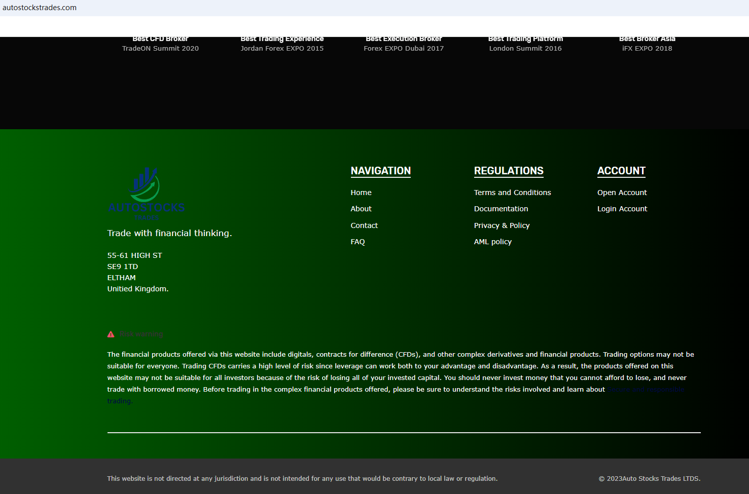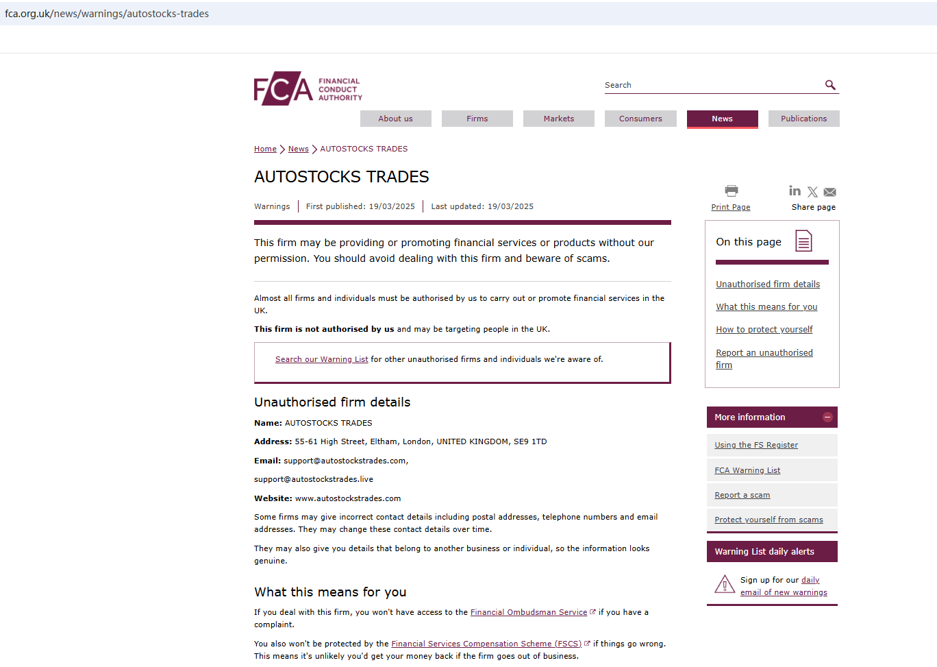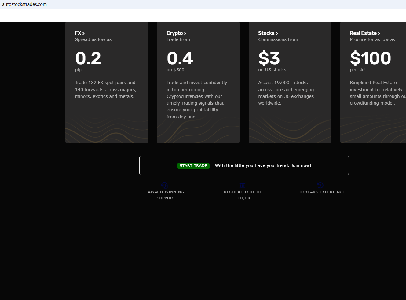 The website uses a common template for scam websites. They usually have a unified design layout and wording. They have been marked by Brokersview many times before, for example: TRANSCORP CAPITAL INVESTMENTS. What's more, the Financial Conduct Authority (FCA) issued a warning against AUTOSTOCKS TRADES for the lack of the required authorization.