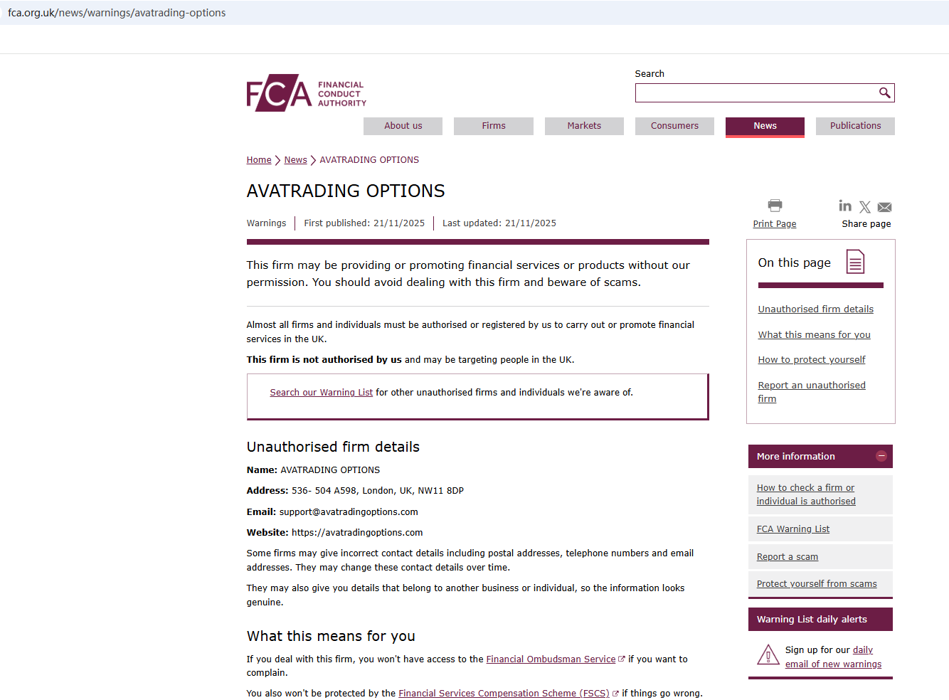 On November 21, 2025, the Financial Conduct Authority (FCA) issued a warning regarding AVATRADING OPTIONS, suspecting that this company may be offering financial services or products without the necessary authorization. https://www.fca.org.uk/news/warnings/avatrading-options