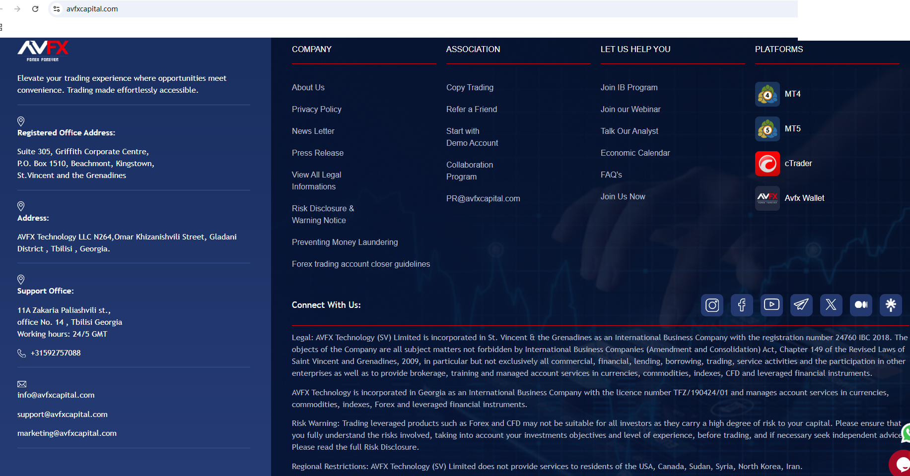 AVFX Capital is registered in both St. Vincent and Georgia. While this registration remains valid, neither the Saint Vincent and the Grenadines Financial Services Authority (SVG FSA) nor the National Bank of Georgia (NBG) has the authority to regulate forex trading, and does not constitute a valid forex license. Furthermore, AVFX Capital does not appear to be authorized by any reputable financial regulator, raising serious concerns about potential fraud.