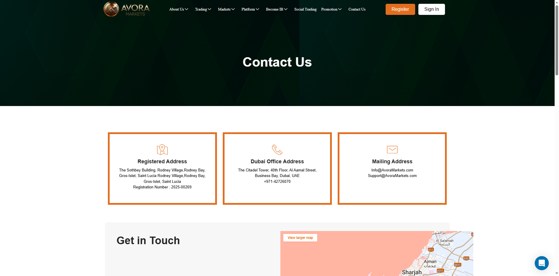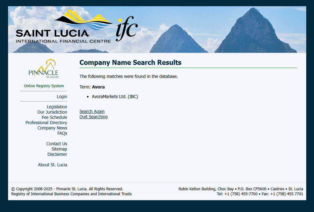 Avora Markets' website lacks clear disclosure of regulatory oversight but only provides a registered address in Saint Lucia and a physical office location in Dubai, United Arab Emirates. While we were able to locate registration records for Avora Markets Ltd within the Saint Lucia International Financial Centre (IFC) registry, it is crucial to understand that this registration does not equate to authorization for forex activities.