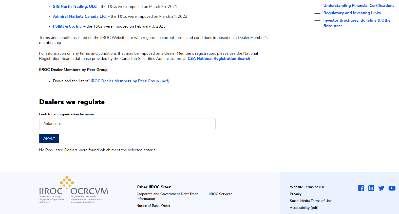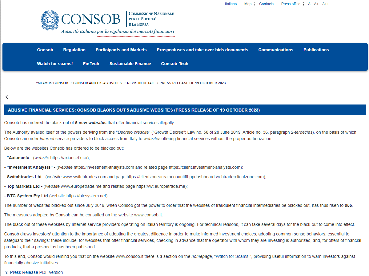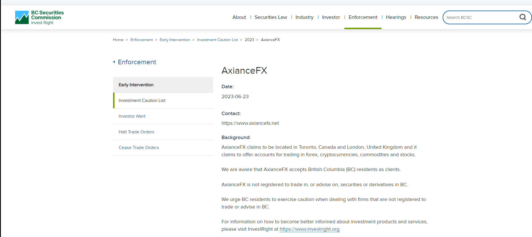 In addition, the British Columbia Securities Commission (BCSC) and the Commission Nazionale per le Società e la Borsa (CONSOB) issued a warning against AxianceFX, stating that this broker is not registered to trade in, or advise on, securities or derivatives in BC.