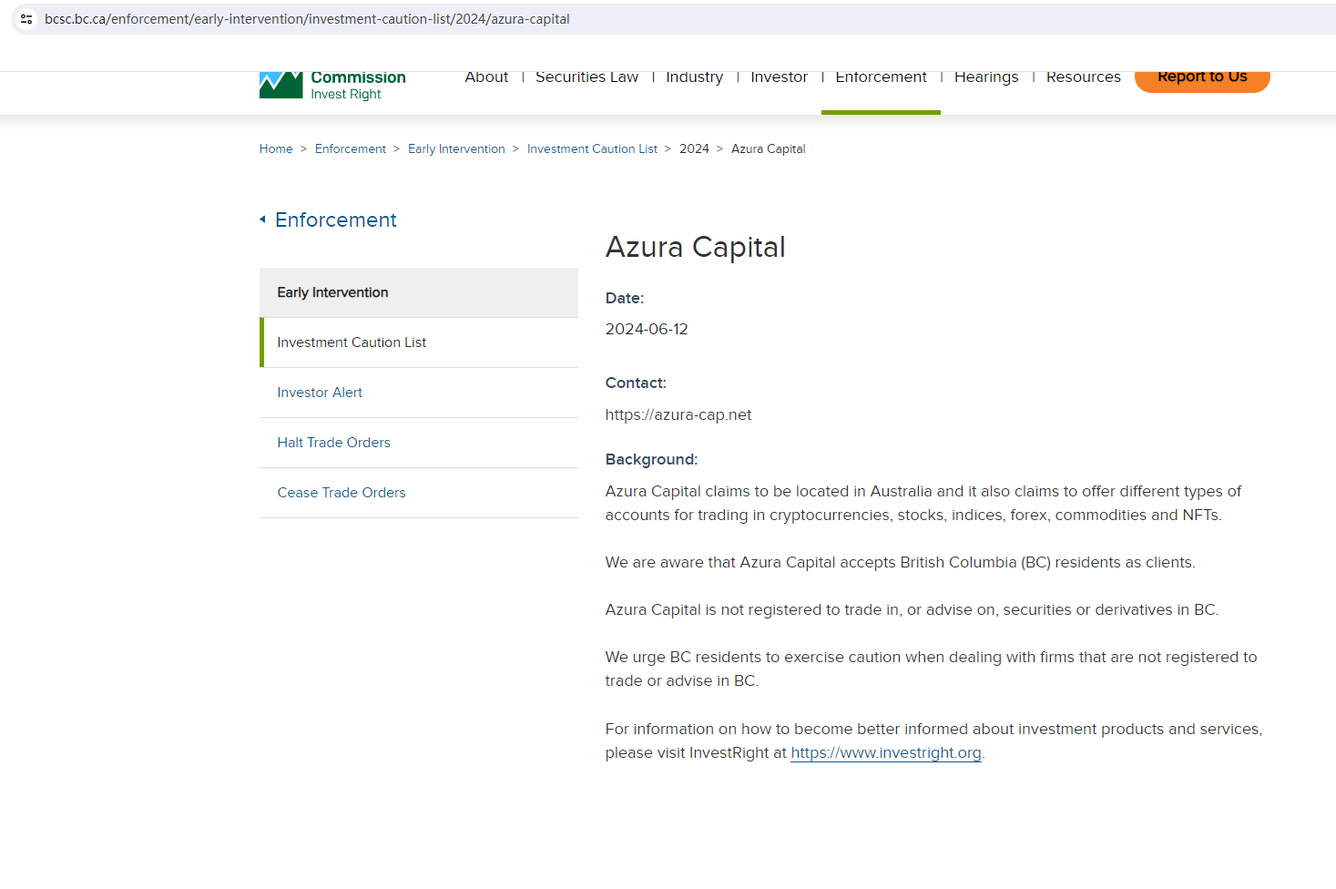 In addition, the United Kingdom Financial Conduct Authority (UK FCA) issued a warning that Azura Capital was providing finacial services or products without authorisation.