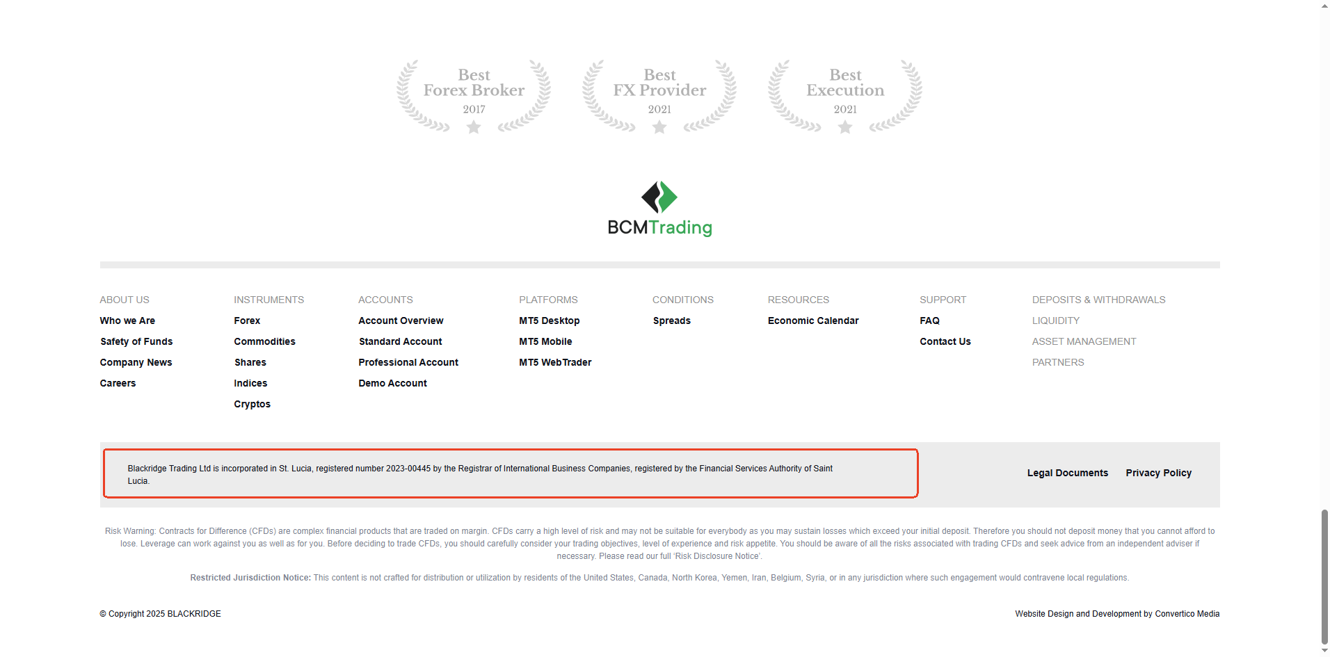 BCM Trading claims to operate under Blackridge Trading Ltd, which is registered with the Saint Lucia International Financial Centre (IFC). While we can confirm that a matching entity exists in the Saint Lucia IFC registry, this registration only confers International Business Company (IBC) status, not a legitimate financial services or forex trading license. Importantly, the IFC neither regulates nor authorizes forex trading activities.
