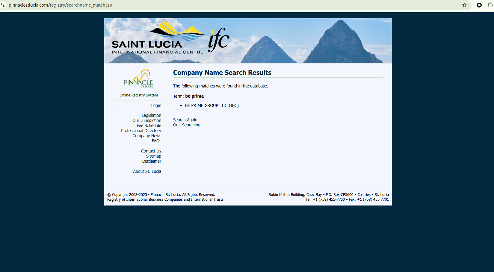Be Prime Broker has no financial regulatory credentials — it is merely registered as an International Business Company (IBC) in Saint Lucia. While a matching entity was found in the Saint Lucia International Financial Centre (IFC) registry, such registration does not equate to a valid financial license. The IFC does not regulate or license forex activities. Therefore, Be Prime Broker appears to hold no licenses from any reputable regulatory authority and be a scam.