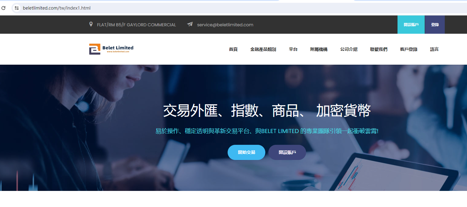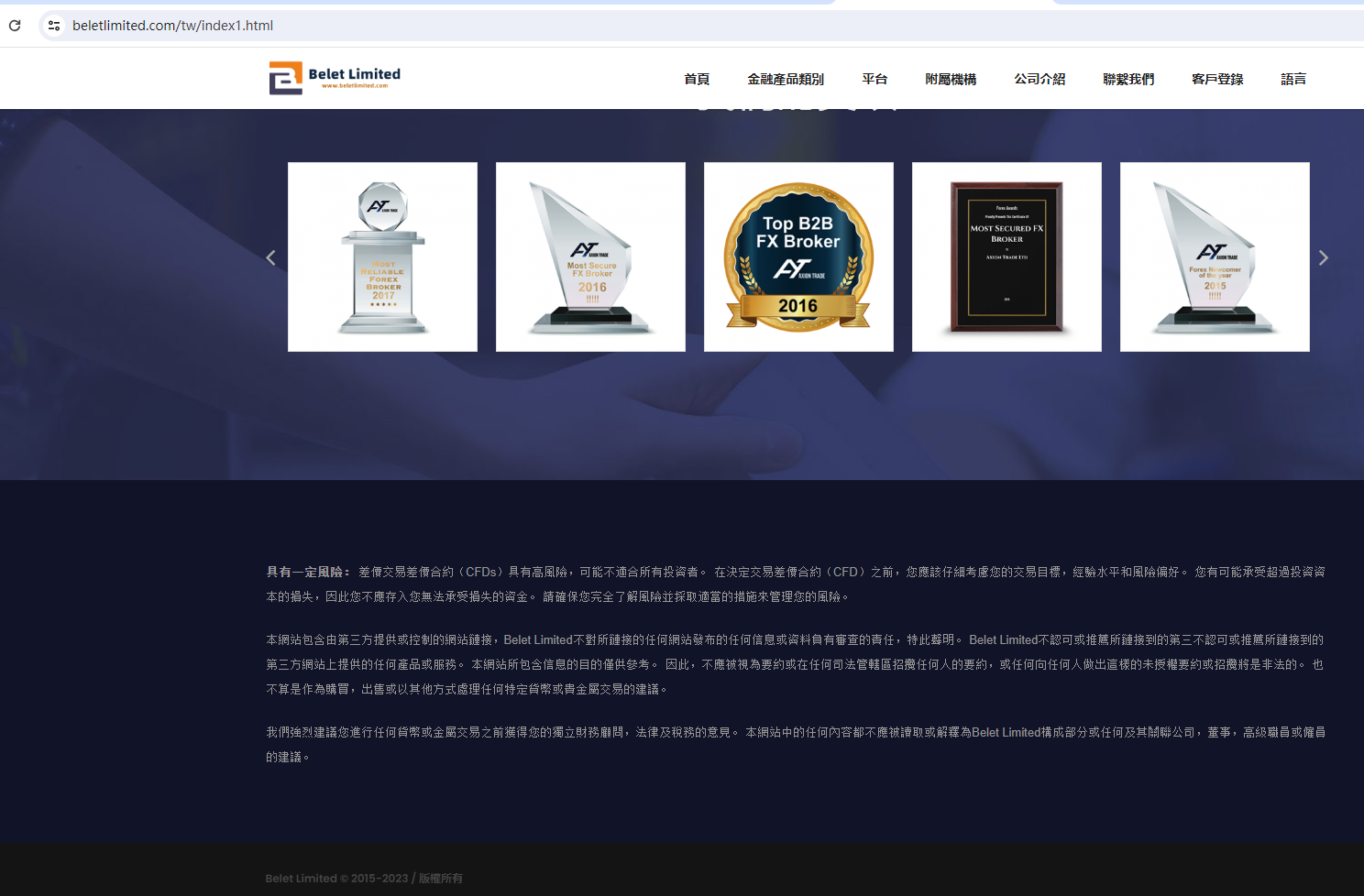 Belet Limited claims to be a reliable company without presenting any information about its regulation or contact. The lack of such important information may be a distinct signal of an unlicensed broker, as regulated companies always present their accreditations and licenses in a prominent position.The truth is that Belet Limited is not under valid regulation by any regulators to do forex. Investors' funds in this broker are unsafe and cannot be protected by any law.Belet Limited is a scam.