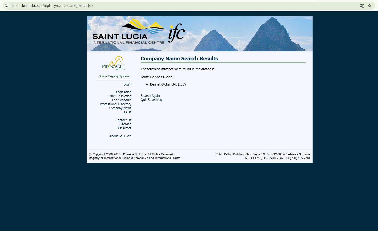 Bennet FX does not claim to be licensed by any regulator; it only claims to be registered in Saint Lucia. While we can confirm that there is a company with the same name in the Saint Lucia International Financial Centre (IFC) registry, this registration only grants it International Business Company (IBC) status. This does not constitute a valid financial licence. The IFC neither regulates nor licences forex trading activities.