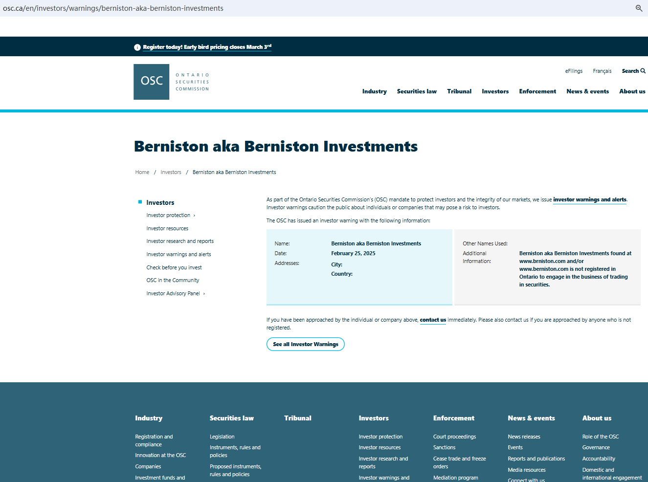In addition, the Ontario Securities Commission (OSC) issued a warning against Berniston aka Berniston Investments, believing this company might be providing financial services or products without proper authorization.