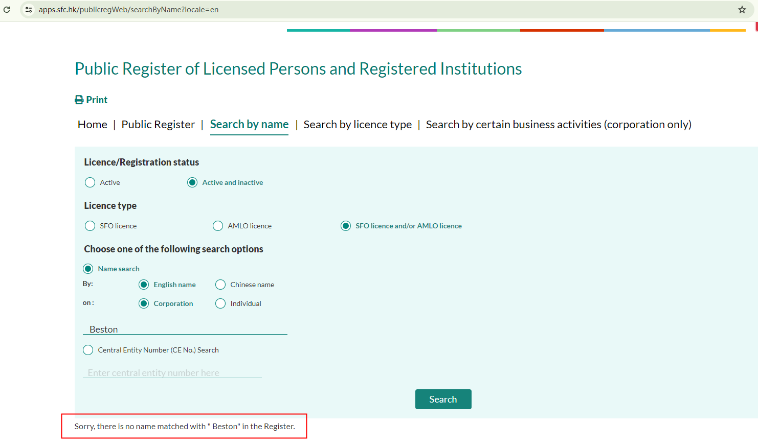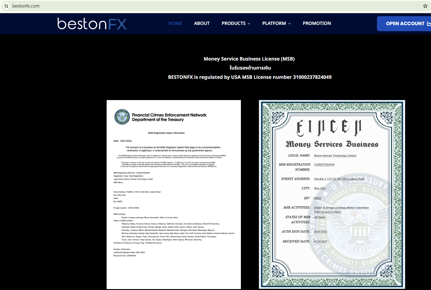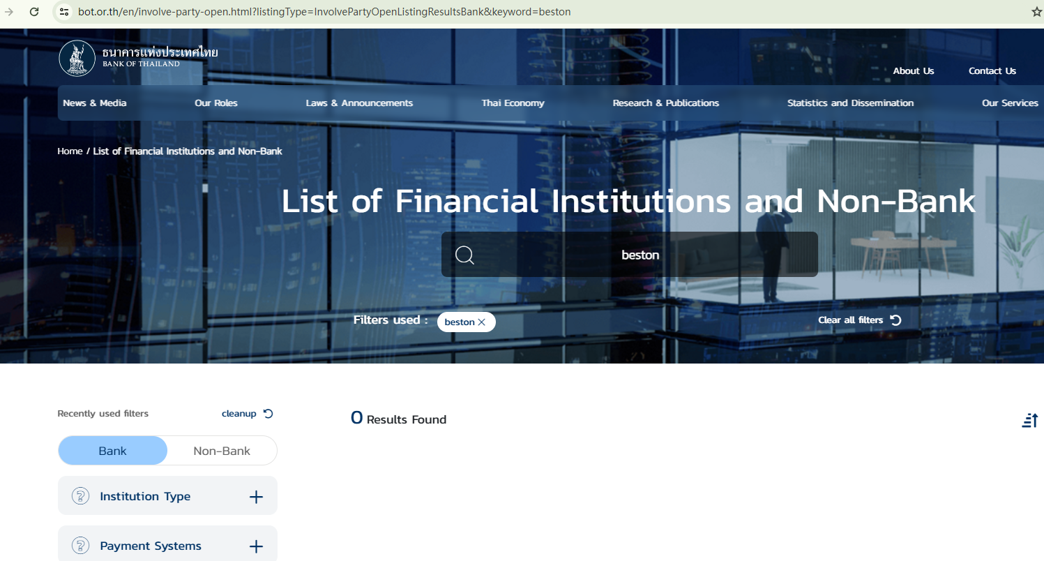 The MSB registration certificate lists its location as Hong Kong. However, we found no corresponding entries in the register of the Hong Kong Securities and Futures Commission (HKSFC). As for its claim of being a legitimate forex broker in the UK, our search in the database of the Financial Conduct Authority (FCA) yielded no matching results. Despite its claim of being the "best Thai forex broker", there is no company named "Beston" in the list of financial service providers of the Bank of Thailand.