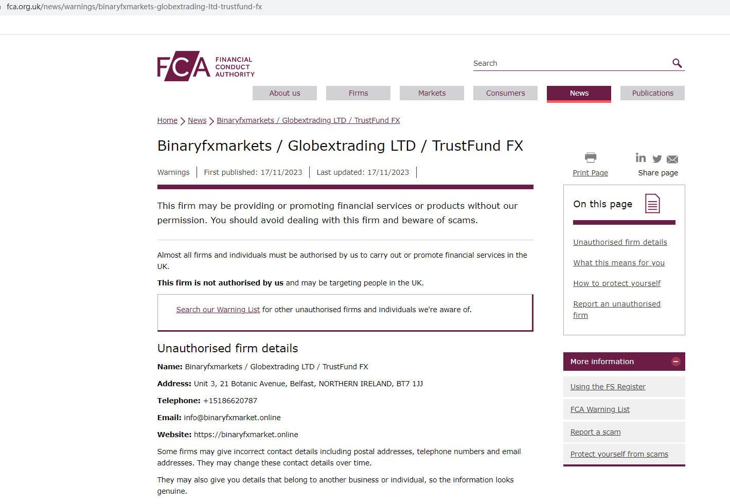 On 17 November 2023, the United Kingdom Financial Conduct Authority (UK FCA) issued a warning that Binaryfxmarkets was providing financial services or products in the UK without authorisation. You may visit: https://www.fca.org.uk/news/warnings/binaryfxmarkets-globextrading-ltd-trustfund-fx