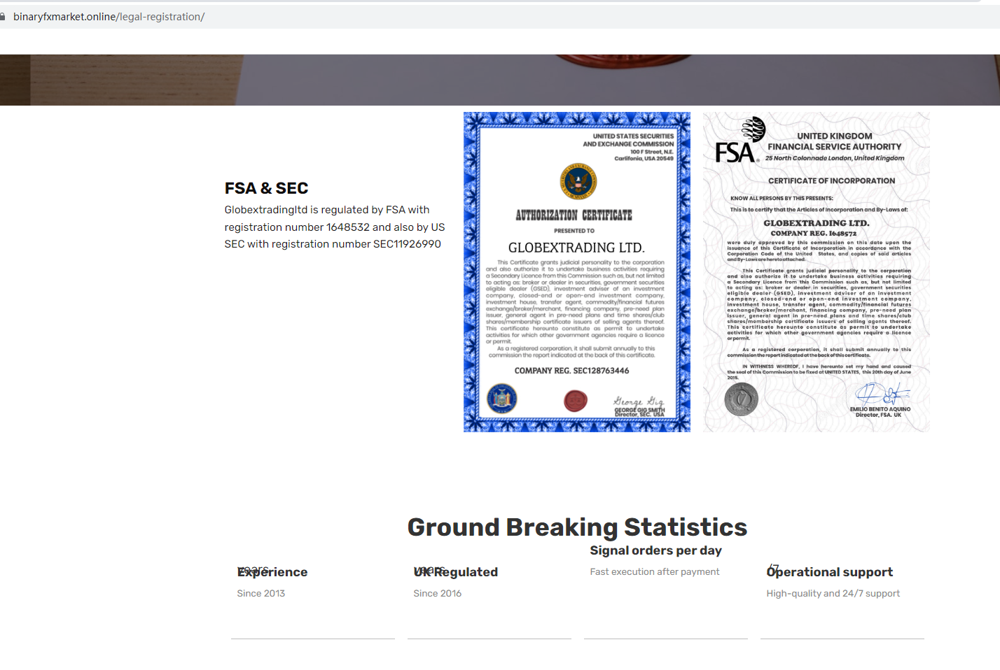 According to its website, it claims to be regulated by the U.S. Securities and Exchange Commission (SEC) with registration number SEC 11926990, but after inquiries, no relevant information was found. In addition, it also mentioned the UK Financial Services Authority (FSA), but the UK regulatory agency is the Financial Conduct Authority (FCA), not the FSA. This certificate is forged.
