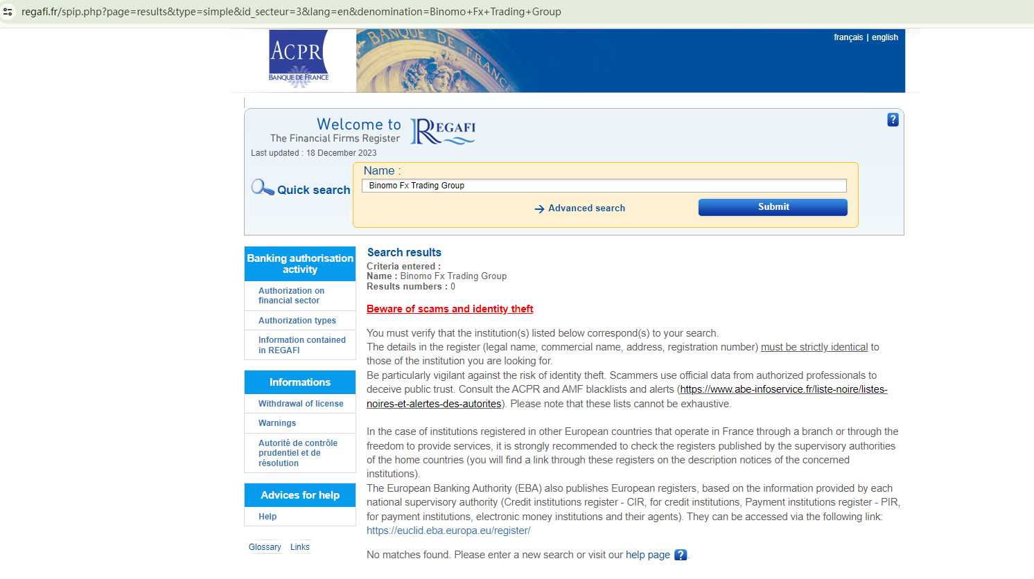 However, our comprehensive investigation has uncovered its fraudulent intentions. As evidenced by screenshots of search results from relevant financial regulatory bodies, it is clear that Binomo Fx Trading is deceiving investors by misappropriating information from its legitimate counterpart.