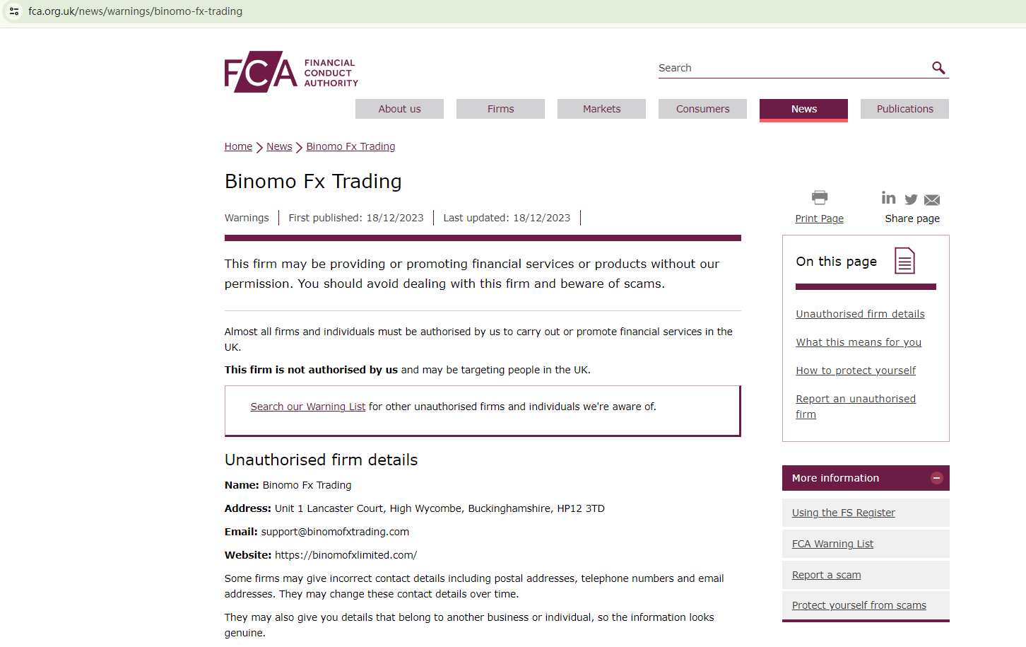 Binomo Fx Trading is, without a doubt, a fraudulent trading platform. It manipulates the information of a regulated broker to give the illusion of legitimacy. By replacing the broker's company names with its own, Binomo Fx Trading attempts to convince unsuspecting investors of its legality. However, our comprehensive investigation has uncovered its fraudulent intentions. As evidenced by screenshots of search results from relevant financial regulatory bodies, it is clear that Binomo Fx Trading is deceiving investors by misappropriating information from its legitimate counterpart.Moreover, to highlight the risks involved and to advise investors to steer clear of this scam, the Financial Conduct Authority (FCA) has issued a warning against Binomo Fx Trading.In summary, Binomo Fx Trading is not regulated by any governing body. Entrusting this broker with investors' funds is extremely risky, as there are no legal protections in place to safeguard the funds.Binomo Fx Trading is unequivocally a scam.